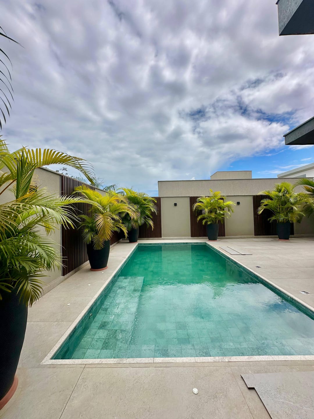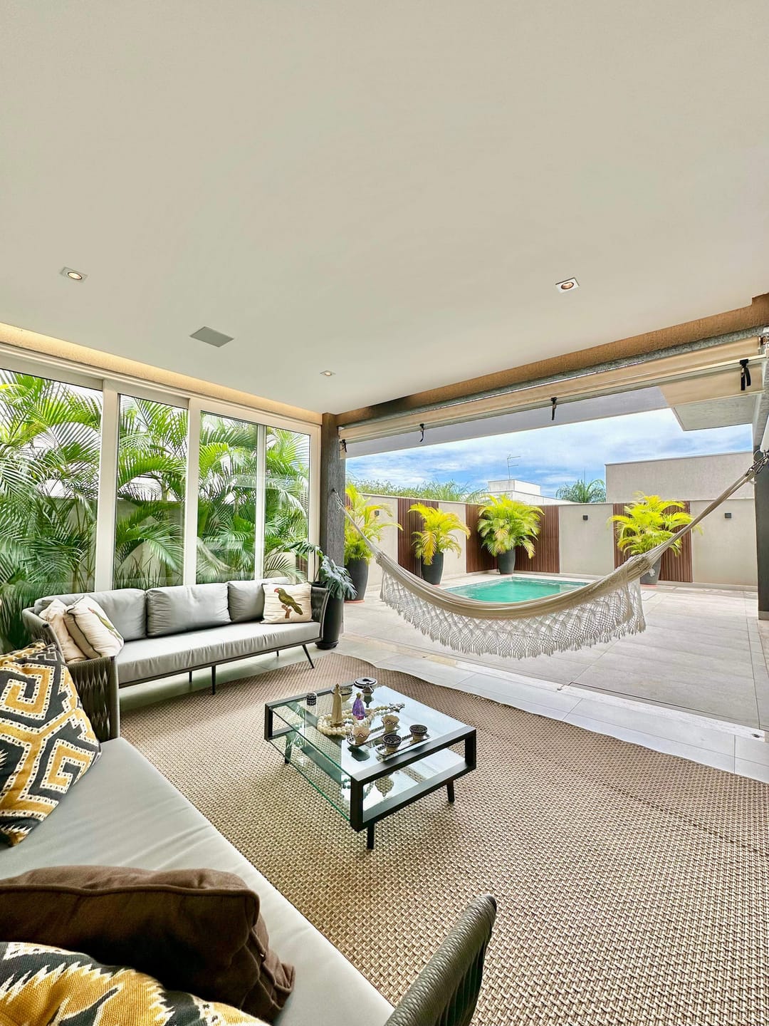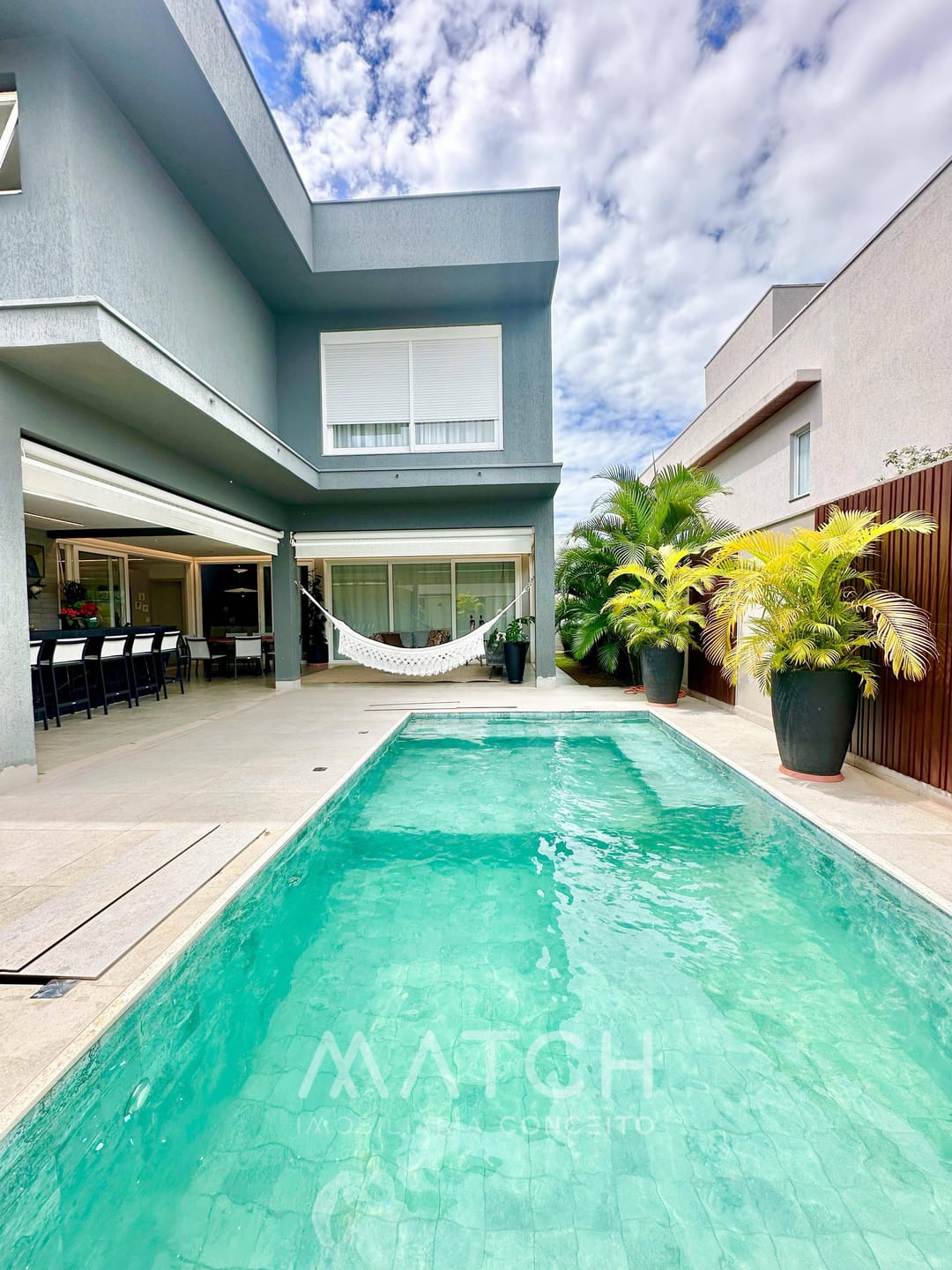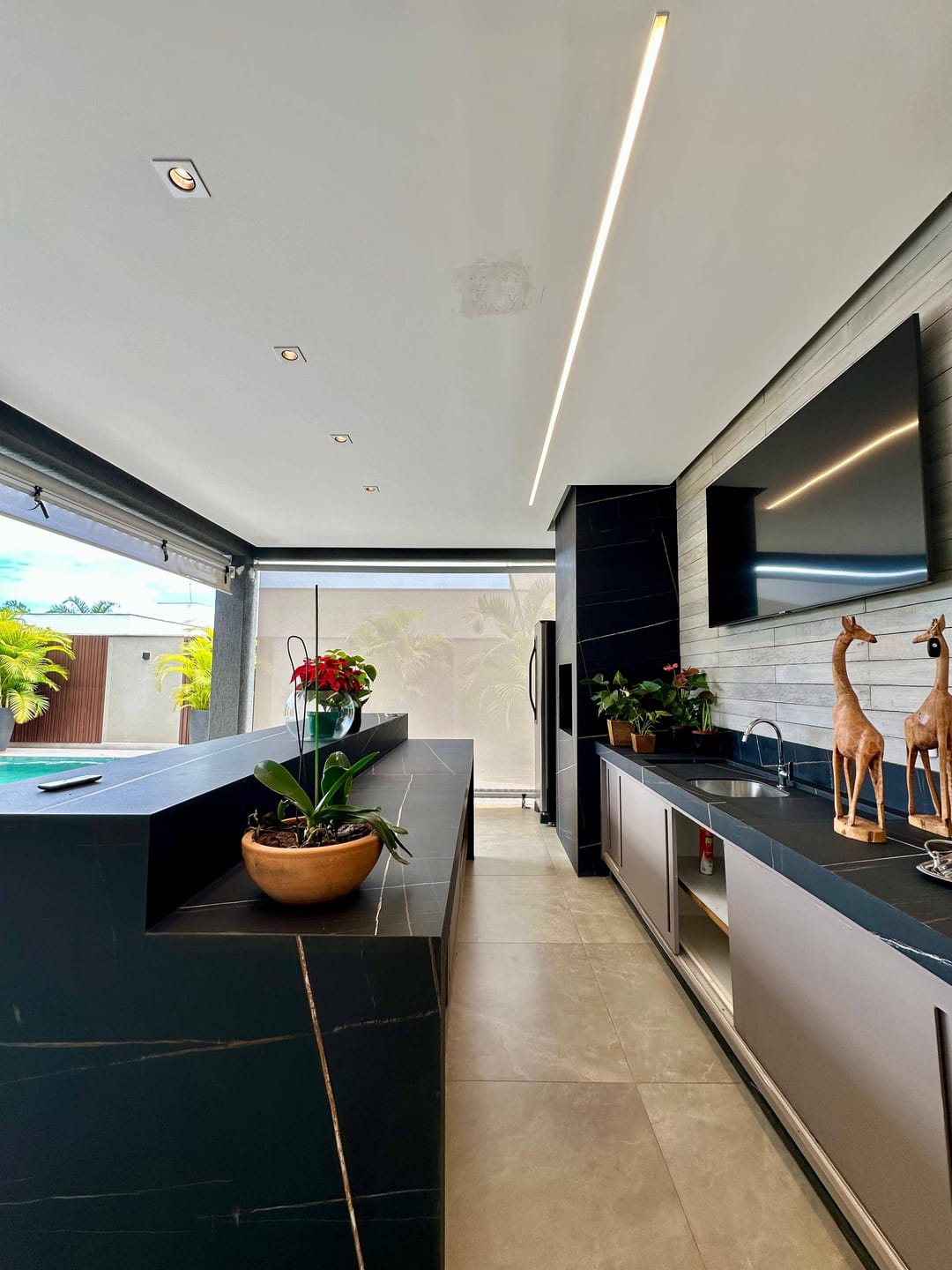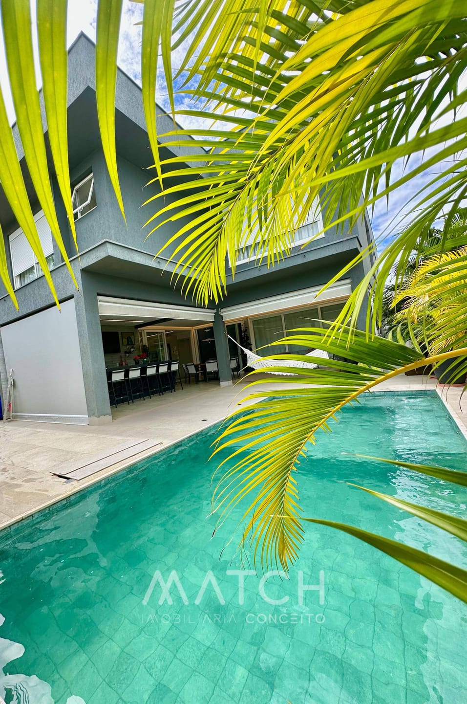 Varanda gourmet completa com churrasqueira a carvão, piscina aquecida com iluminação e spa.