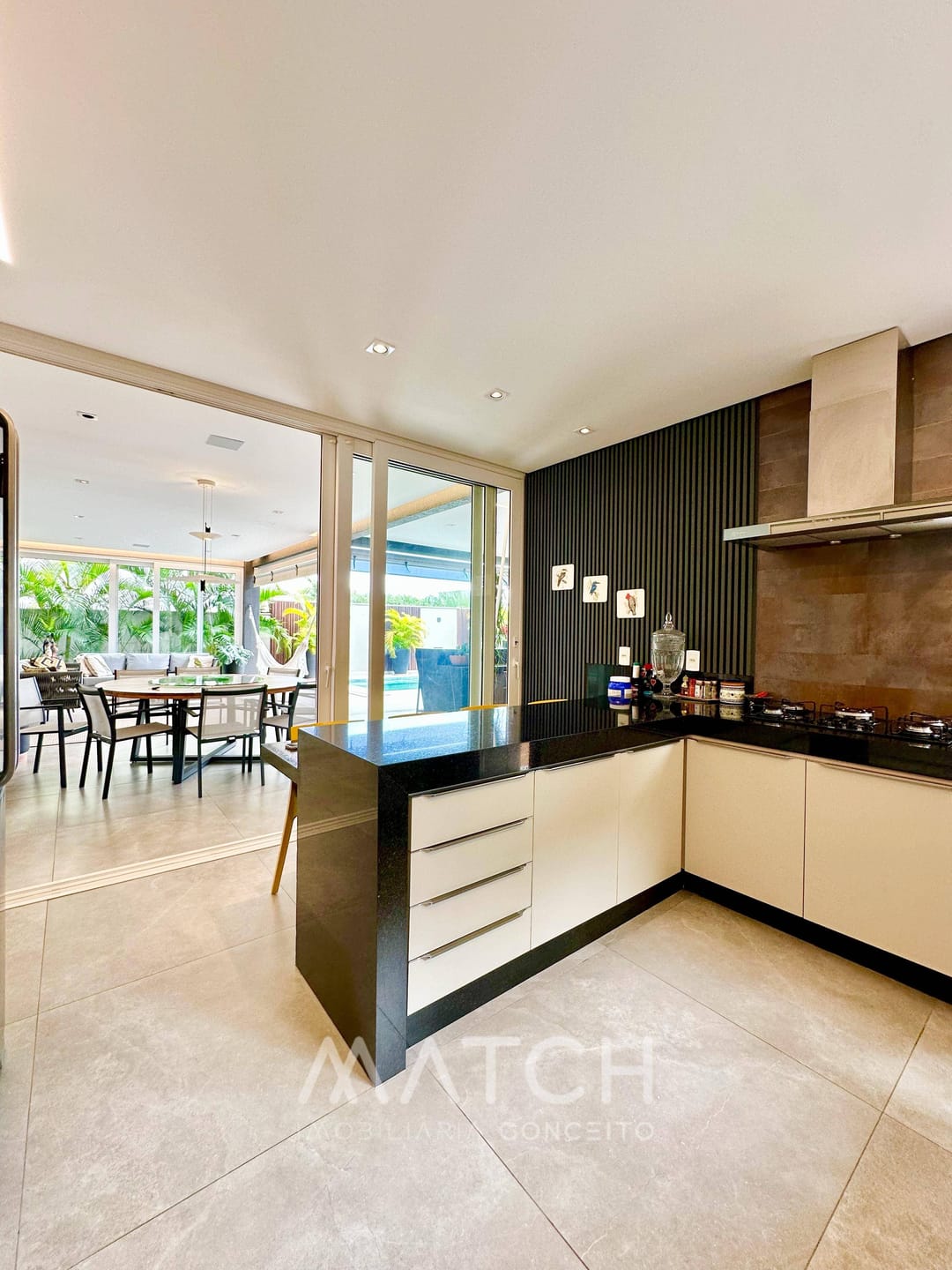 Cozinha individual com ilha gourmet completa em armários.