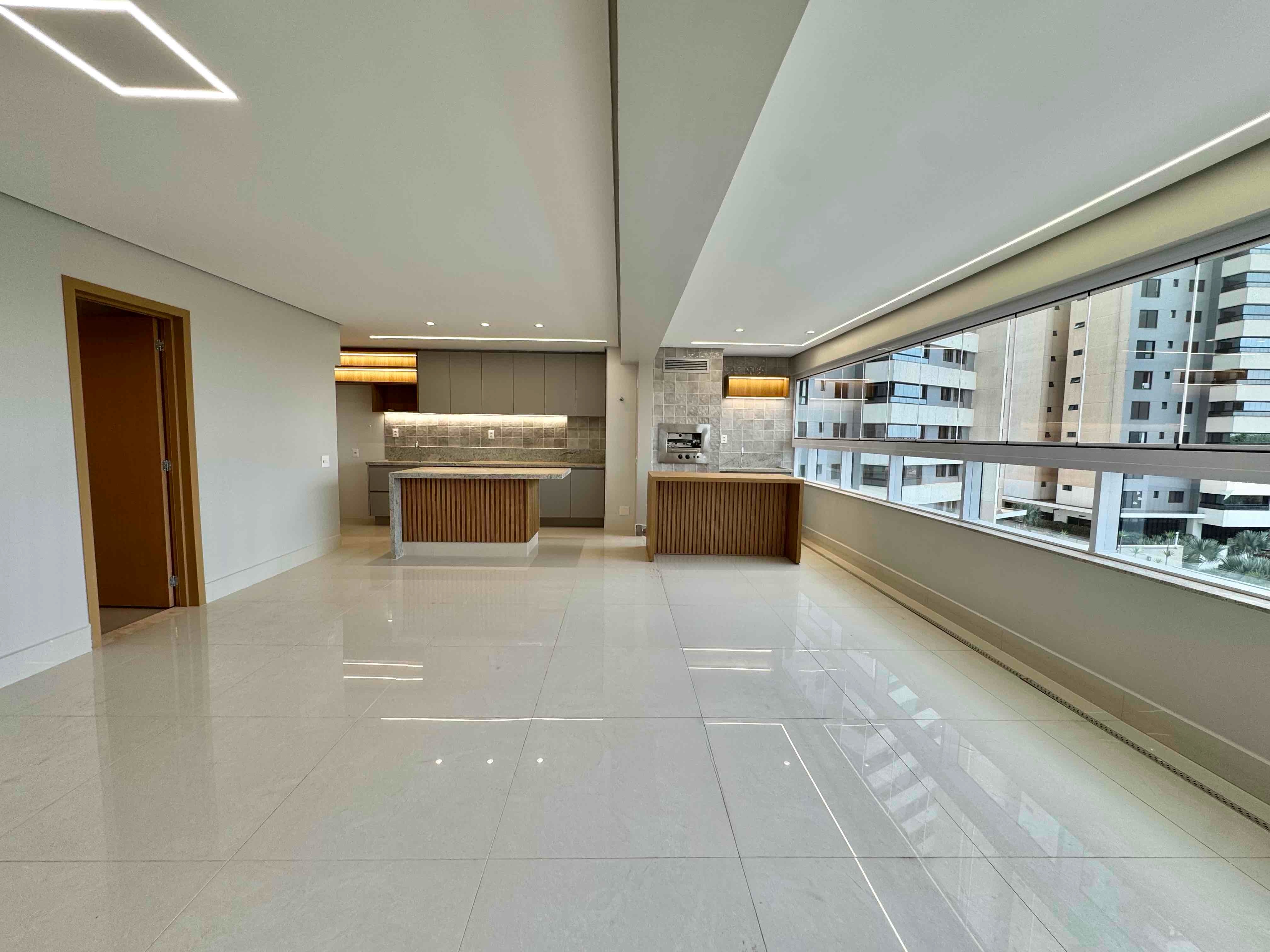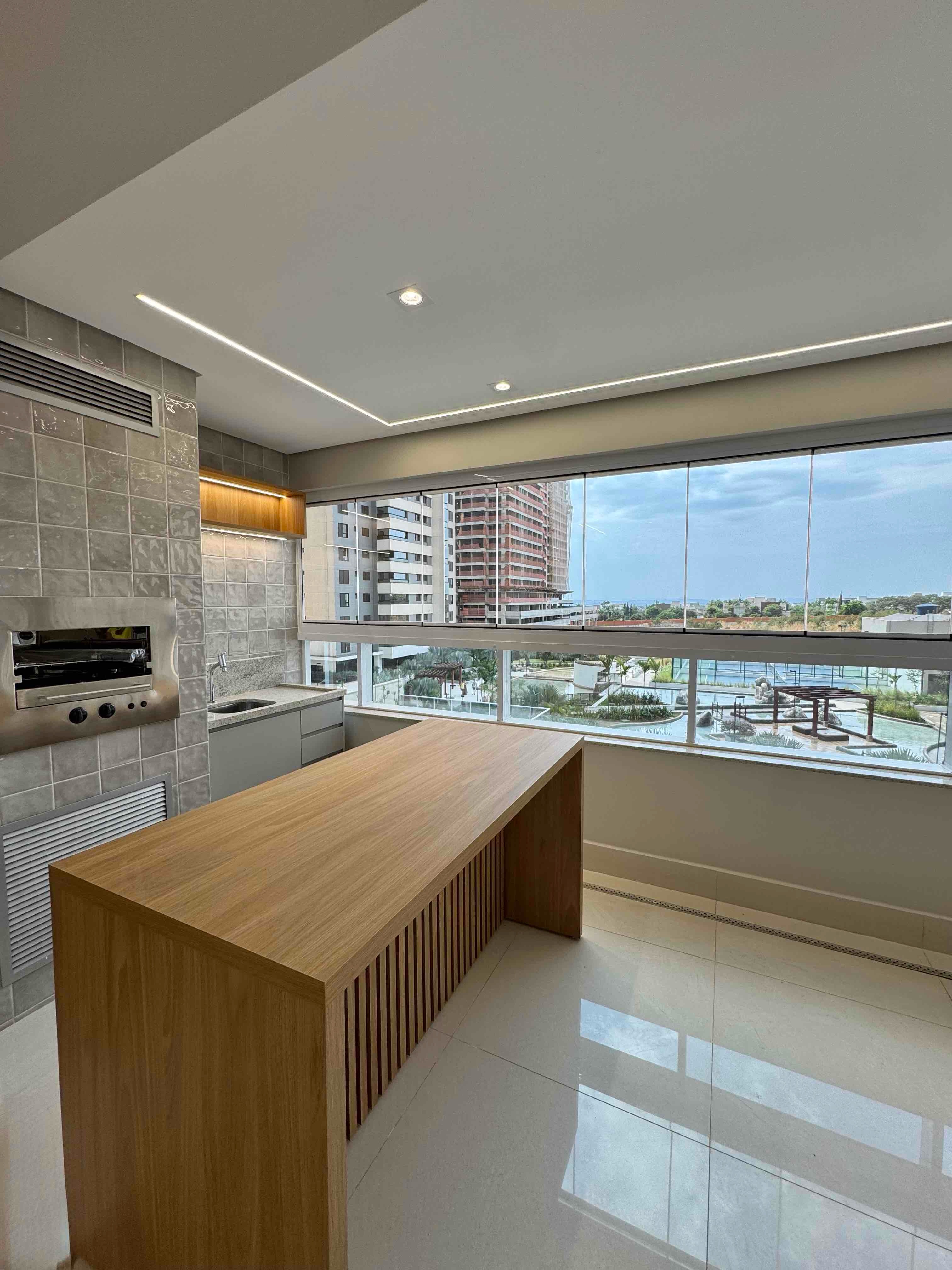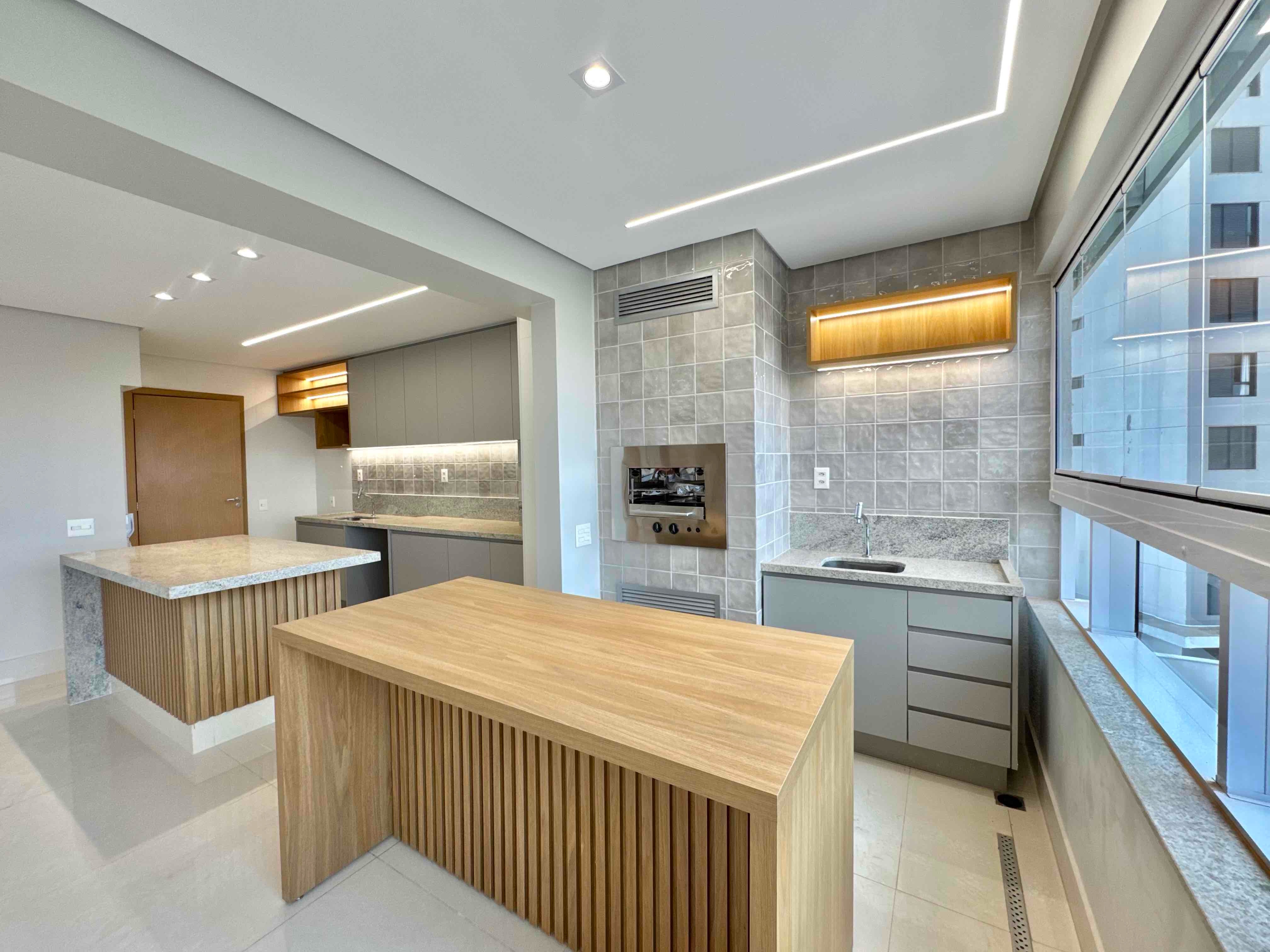 • Sala integrada à cozinha e varanda gourmet com churrasqueira a gás