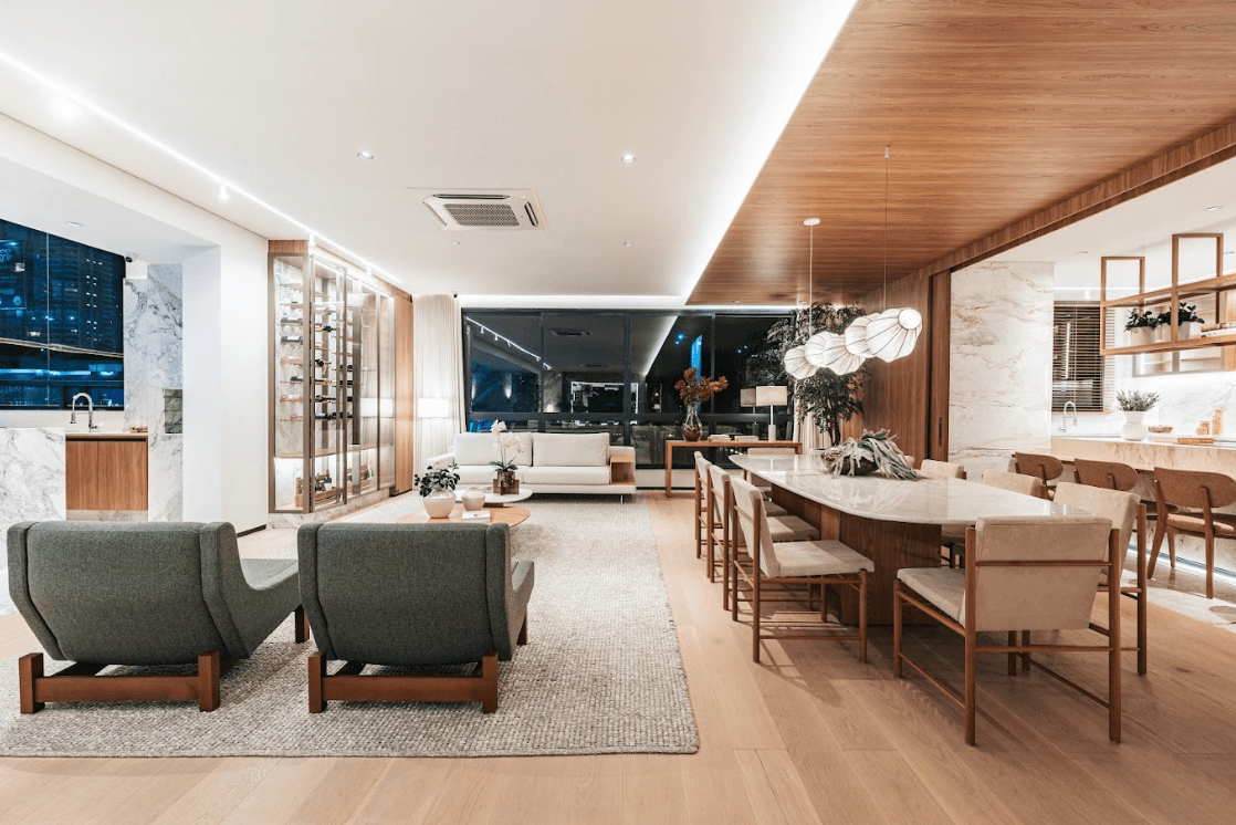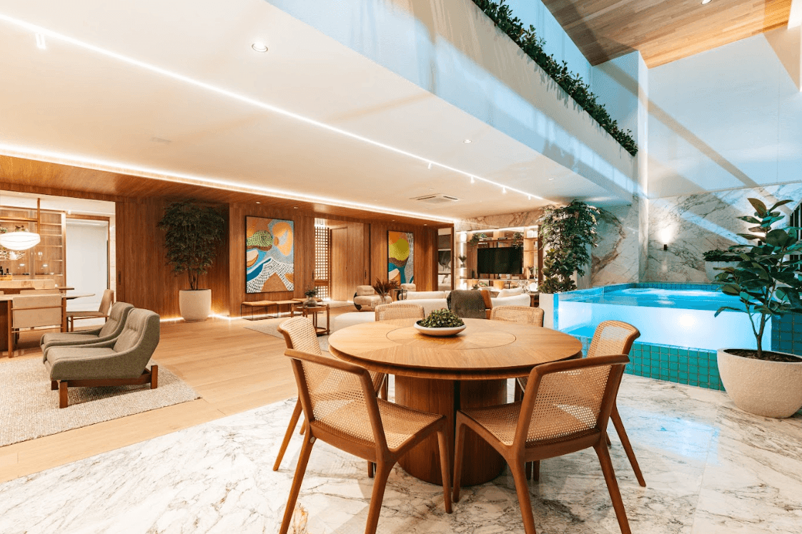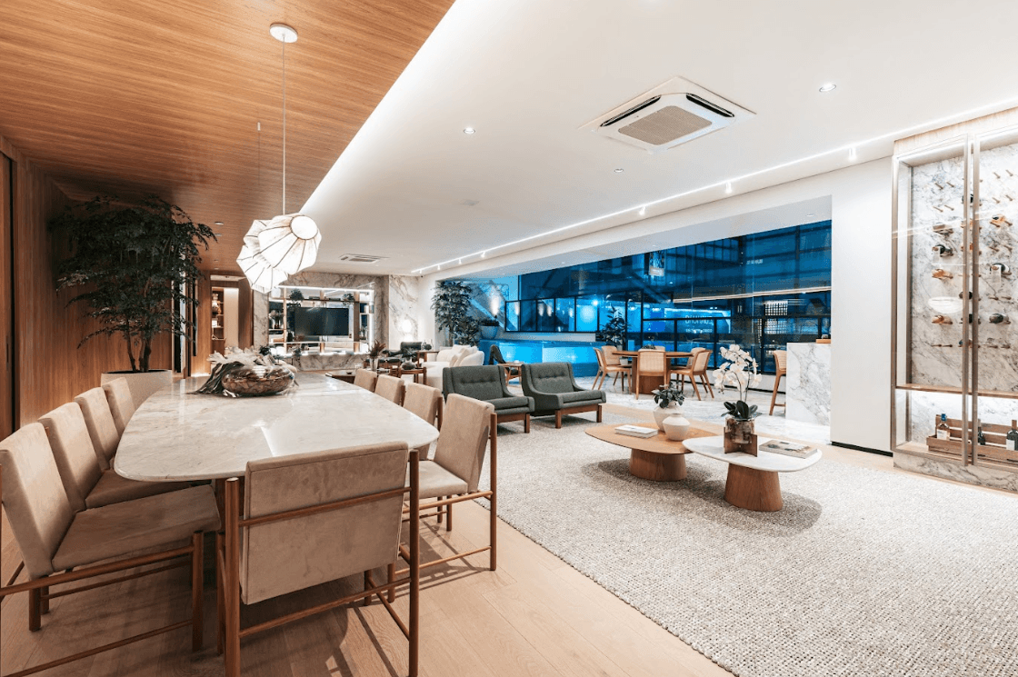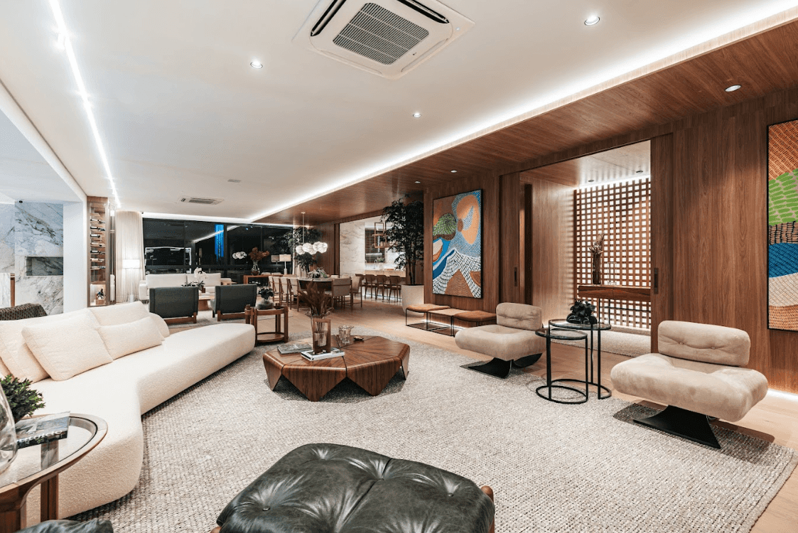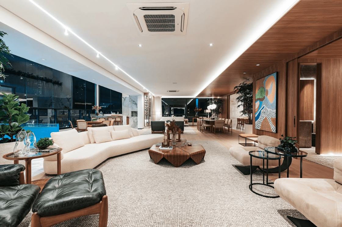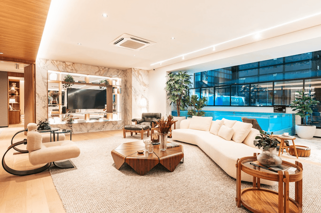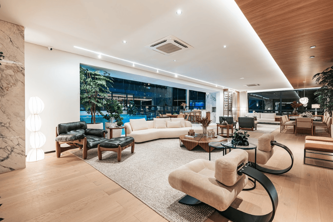 Mobiliários luxuosos nas áreas comuns, com assinaturas de grandes nomes como Sergio Rodrigues e Jorge Zalszupin.