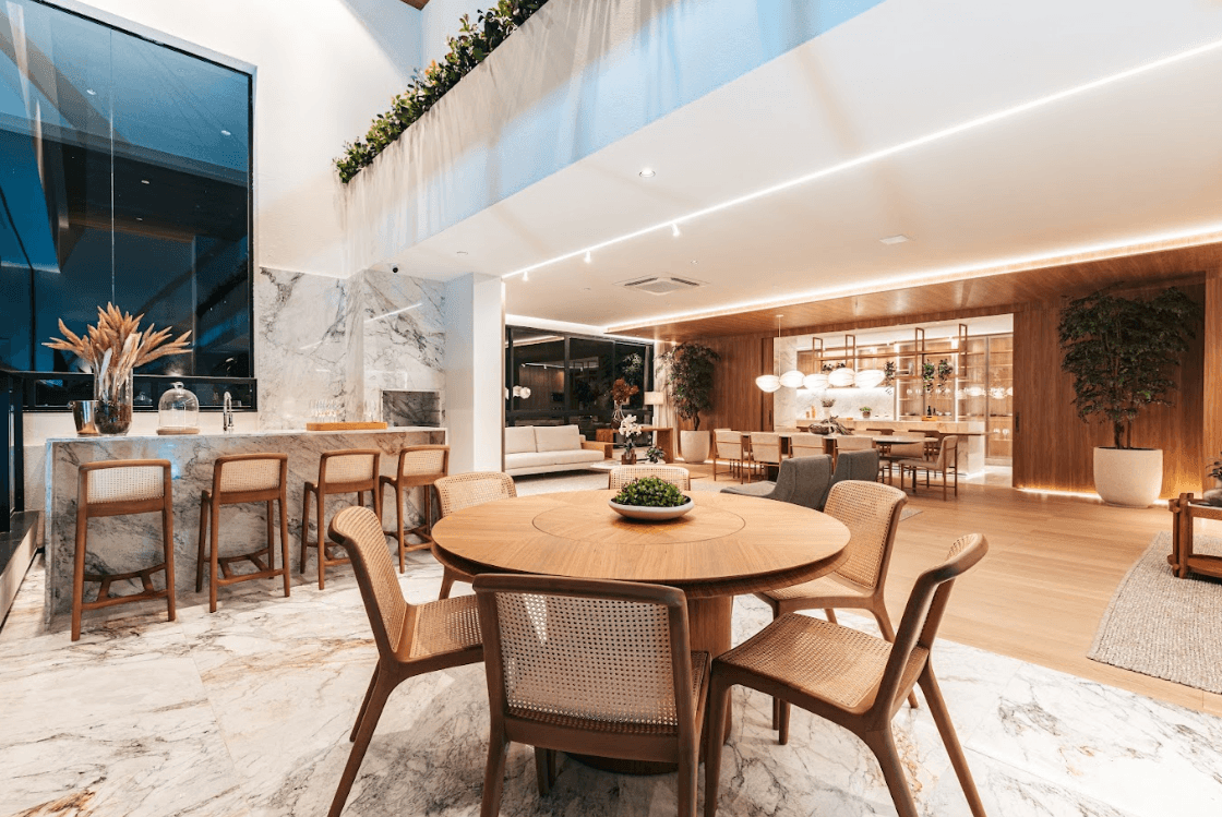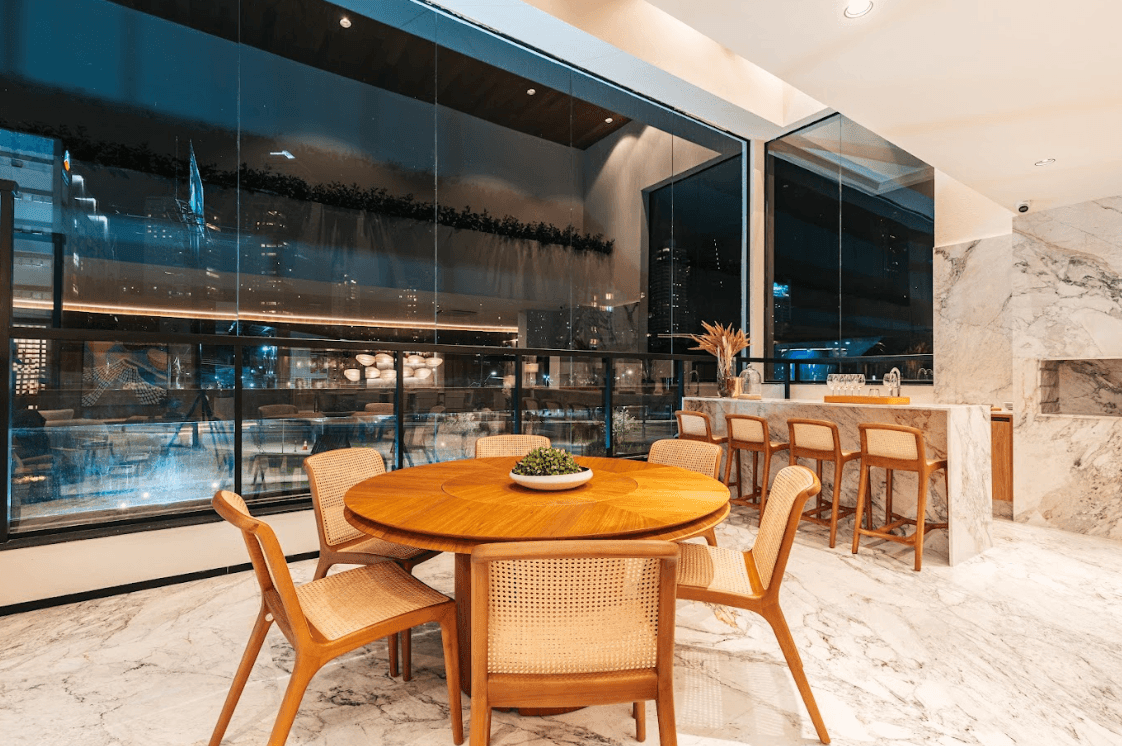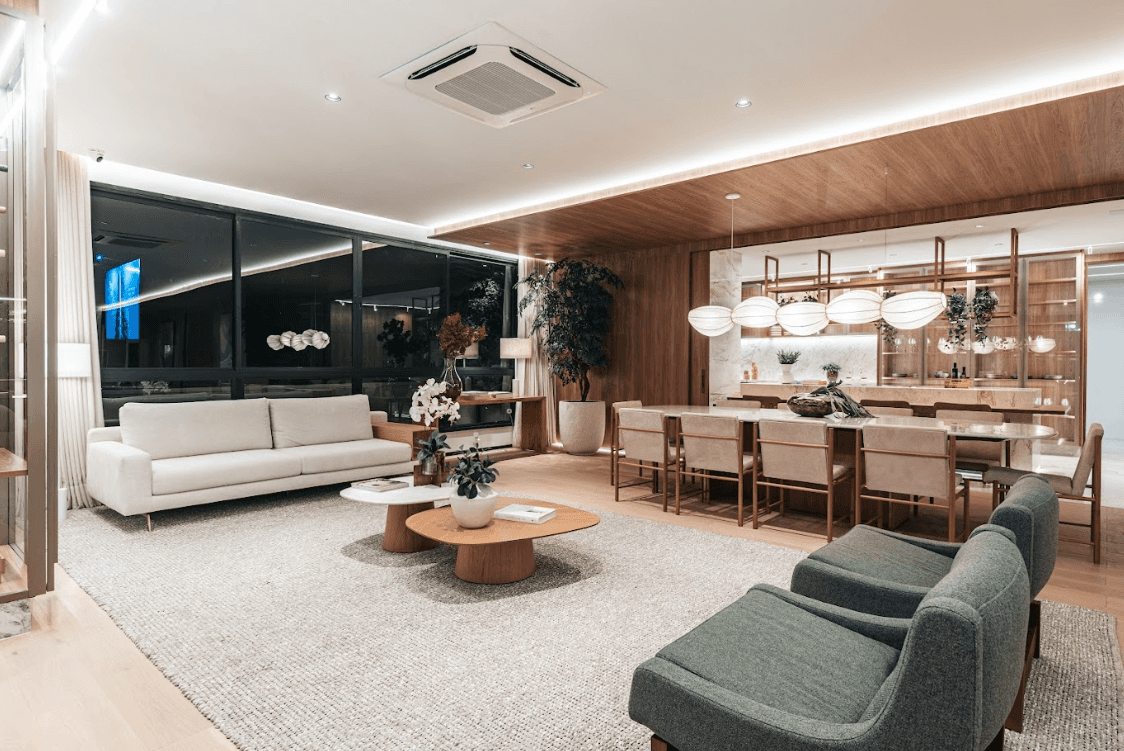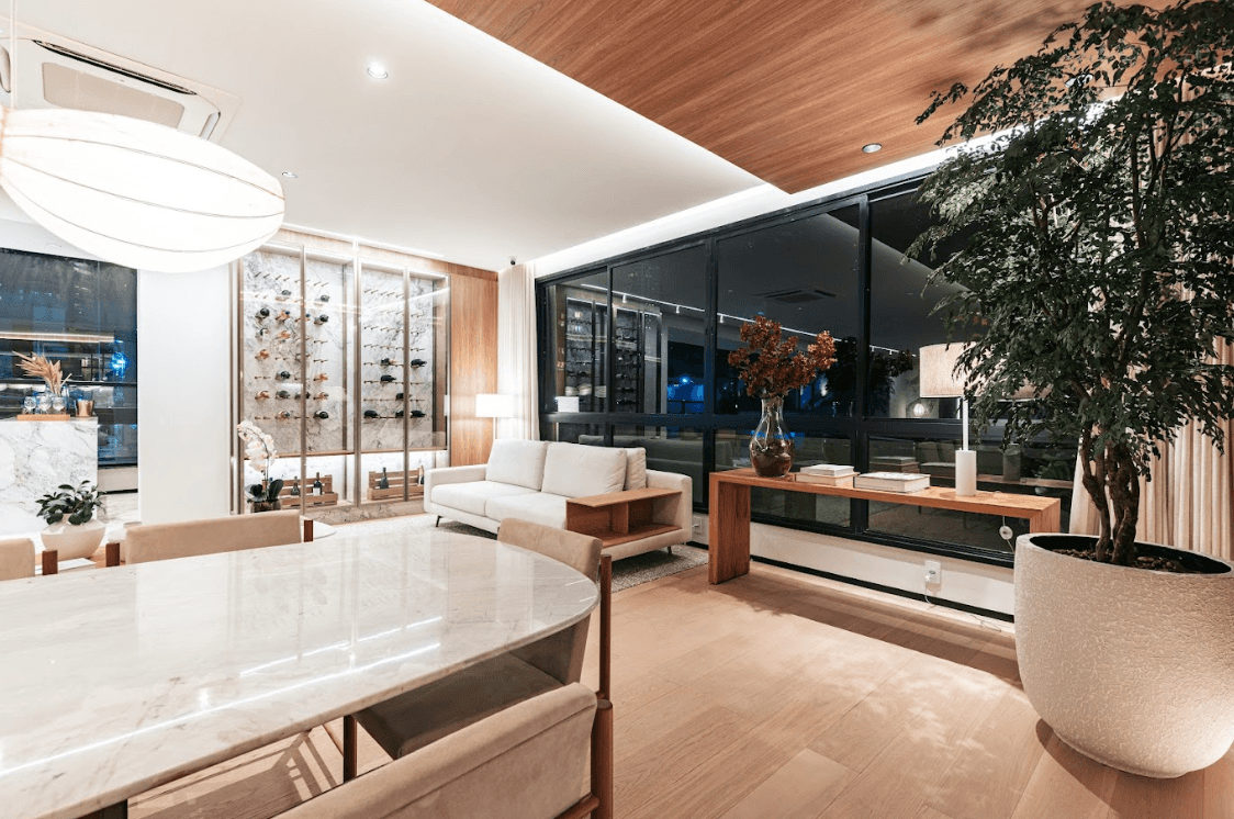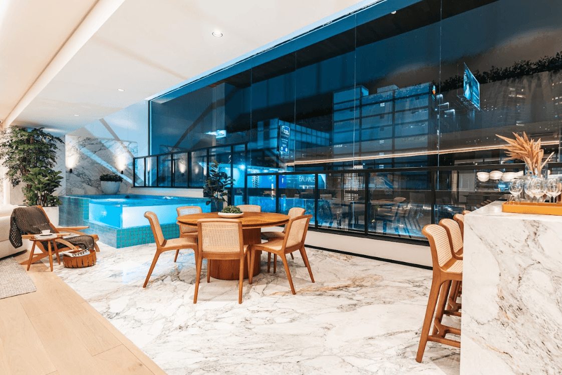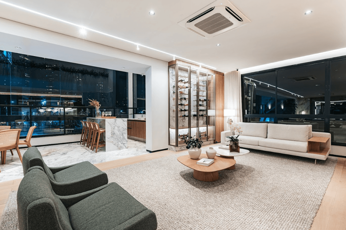 Mobiliários luxuosos nas áreas comuns, com assinaturas de grandes nomes como Sergio Rodrigues e Jorge Zalszupin.