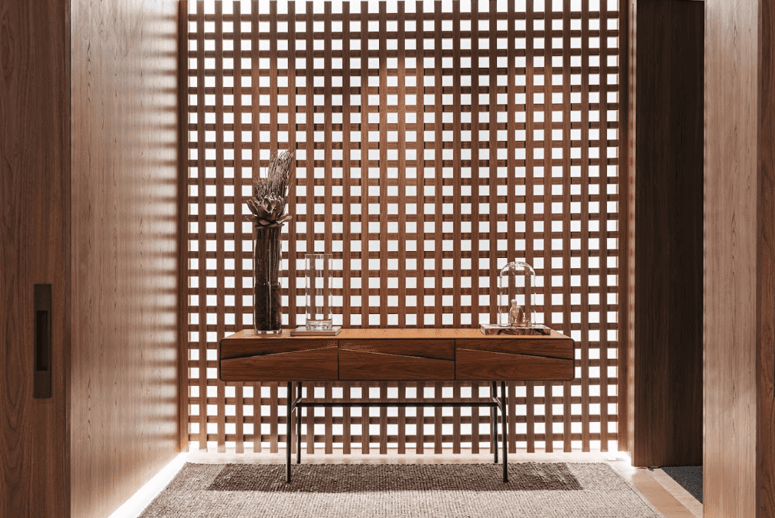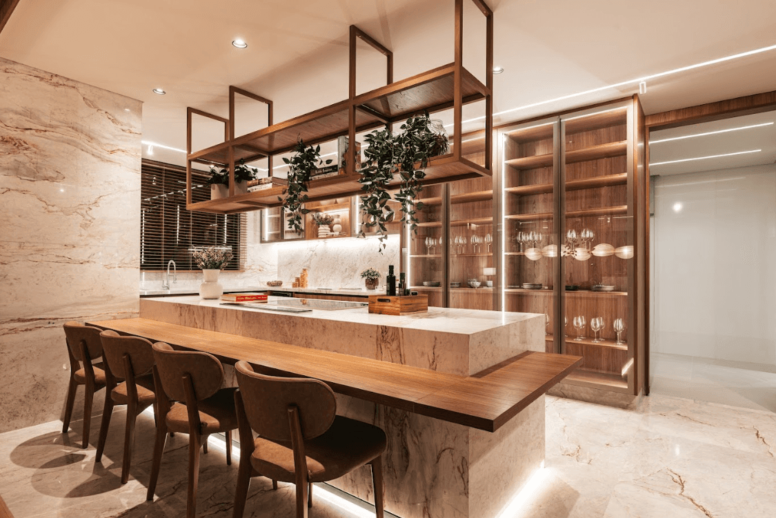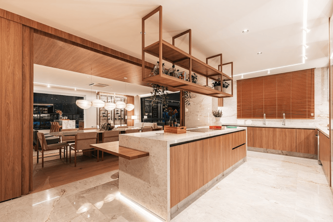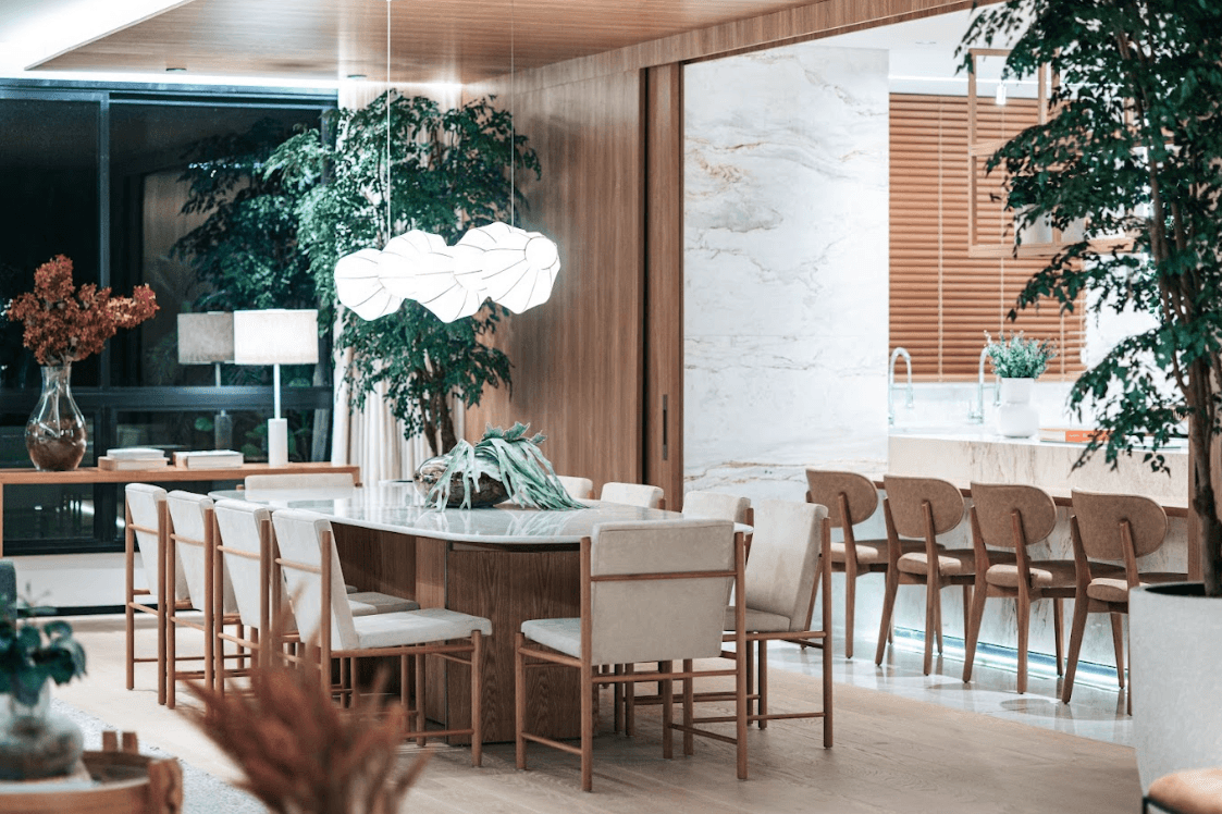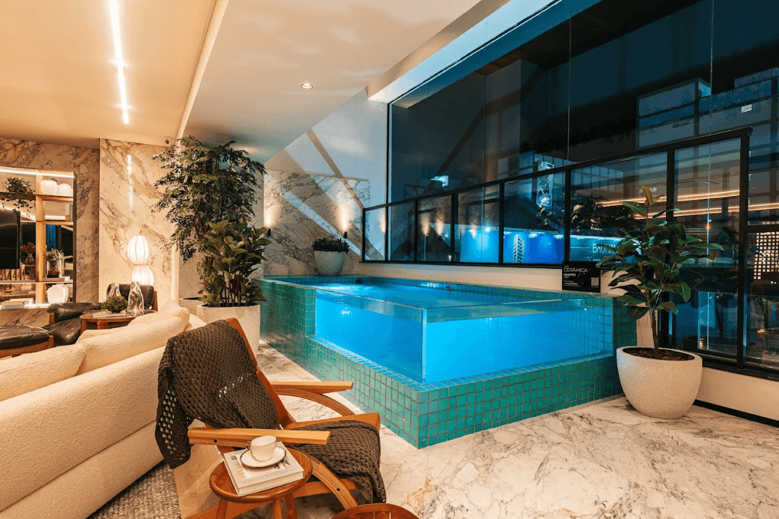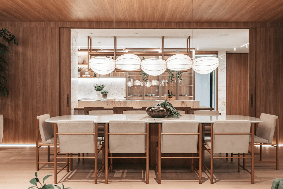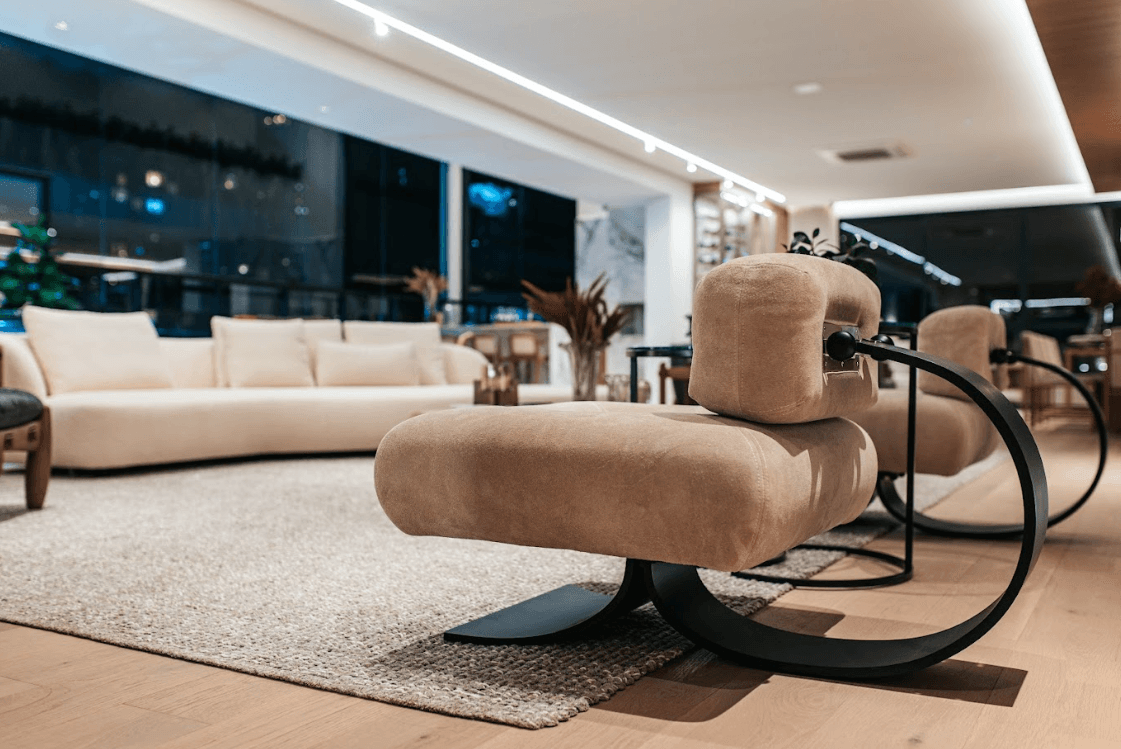 Mobiliários luxuosos nas áreas comuns, com assinaturas de grandes nomes como Sergio Rodrigues e Jorge Zalszupin.