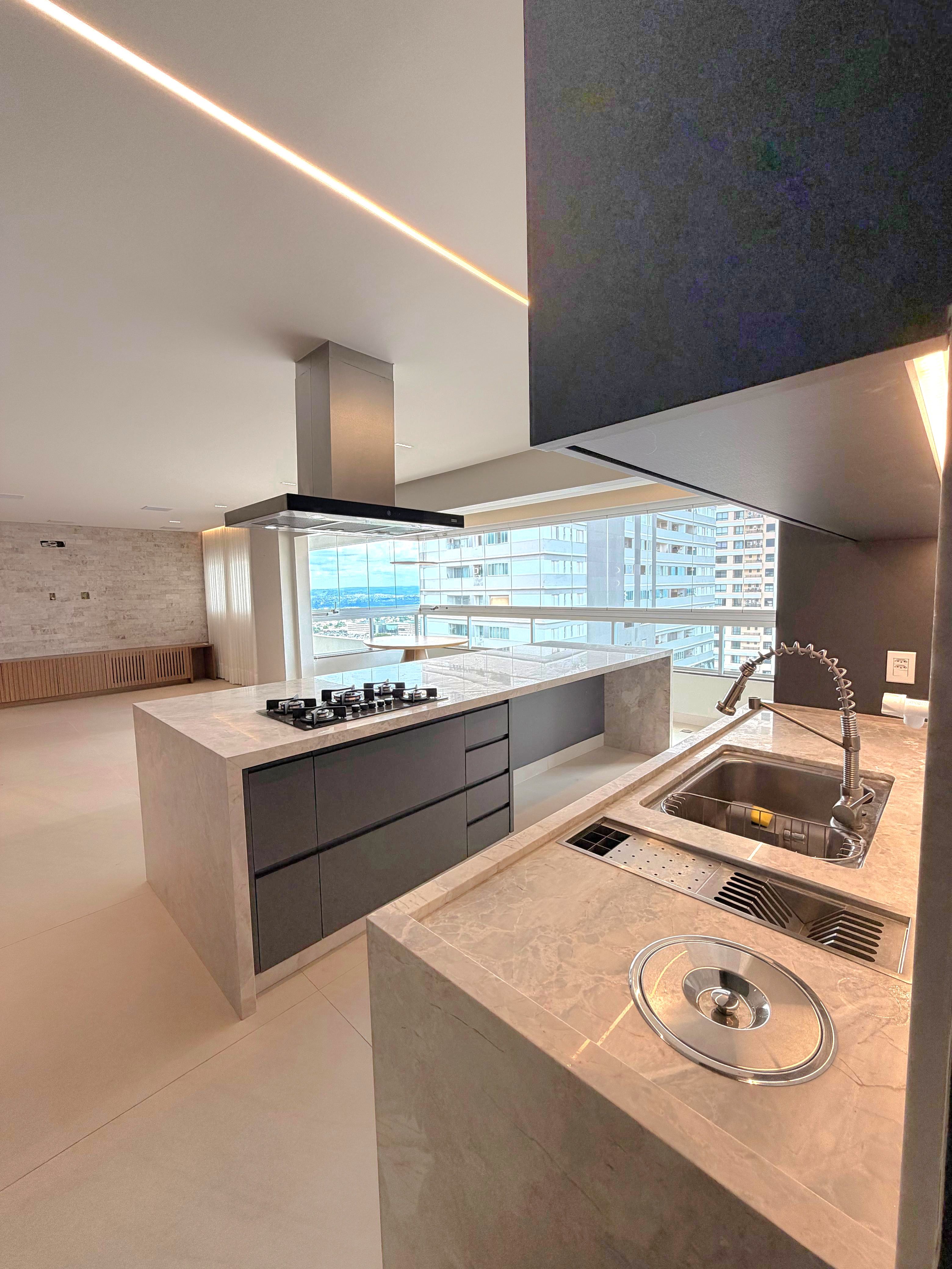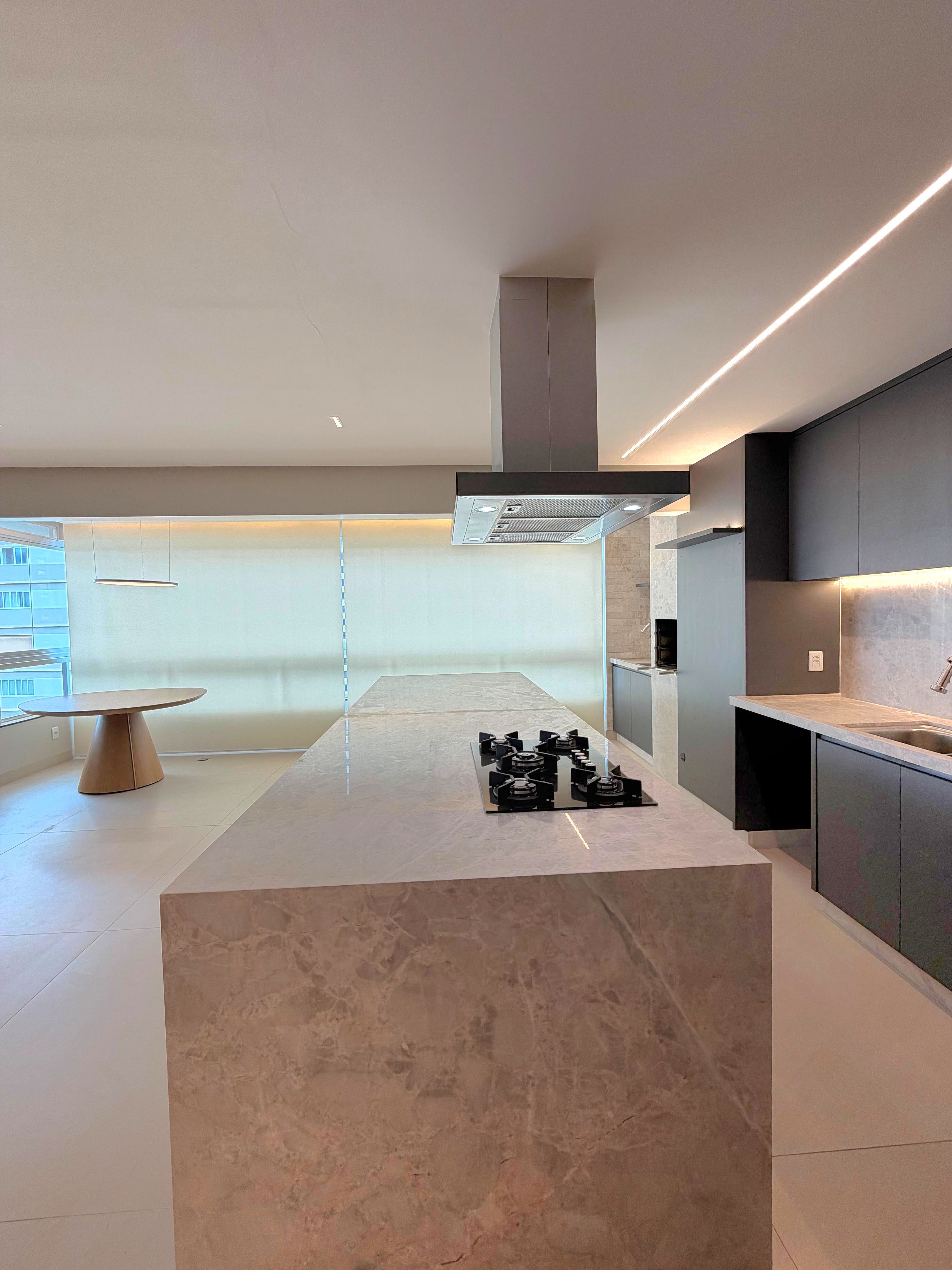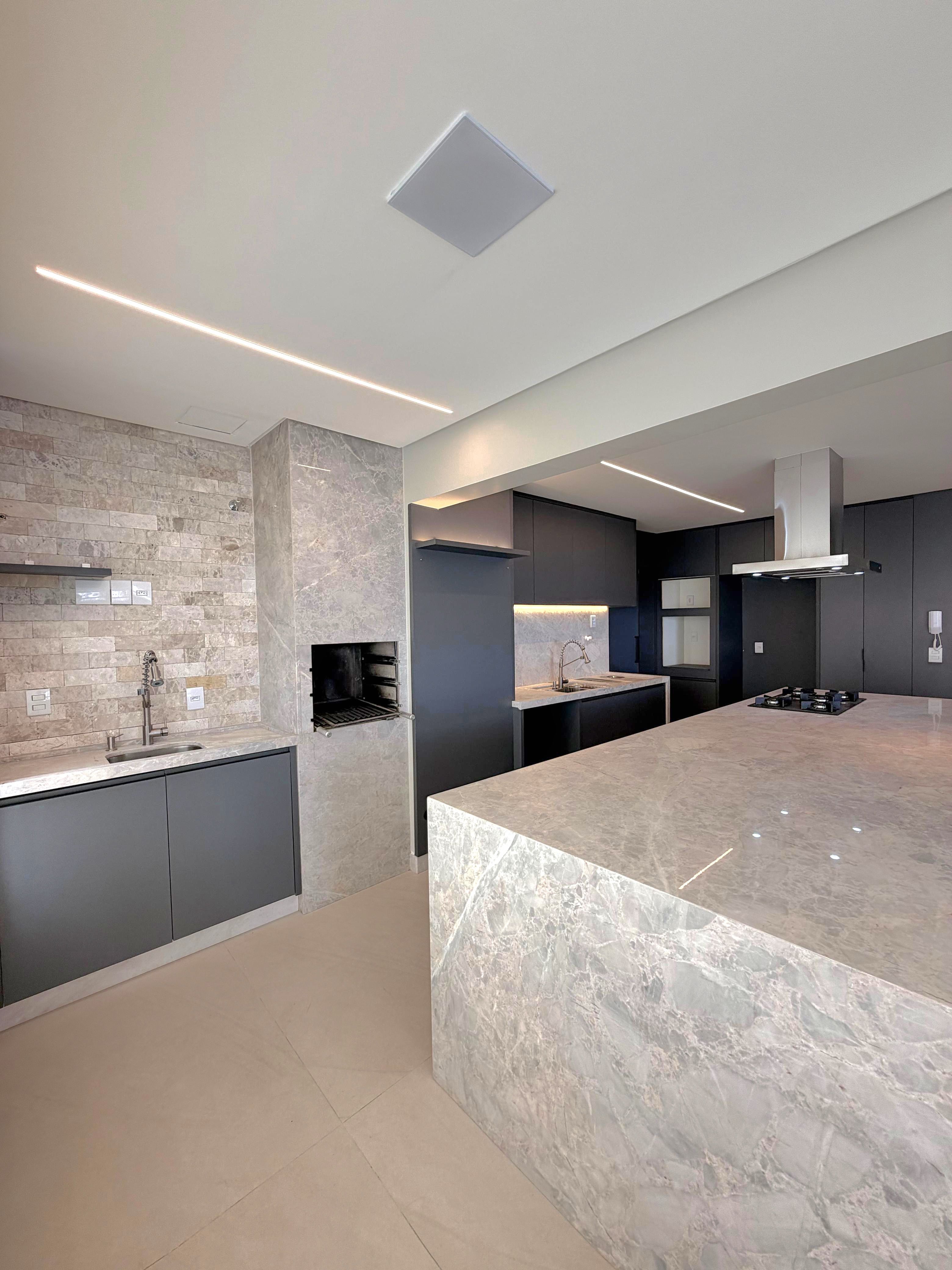 O apartamento foi todo personalizado, e é a única unidade no prédio com integração total da cozinha, sala e varanda gourmet, que possui uma churrasqueira à carvão pra aqueles que adoram churrasco e receber os amigos em casa.