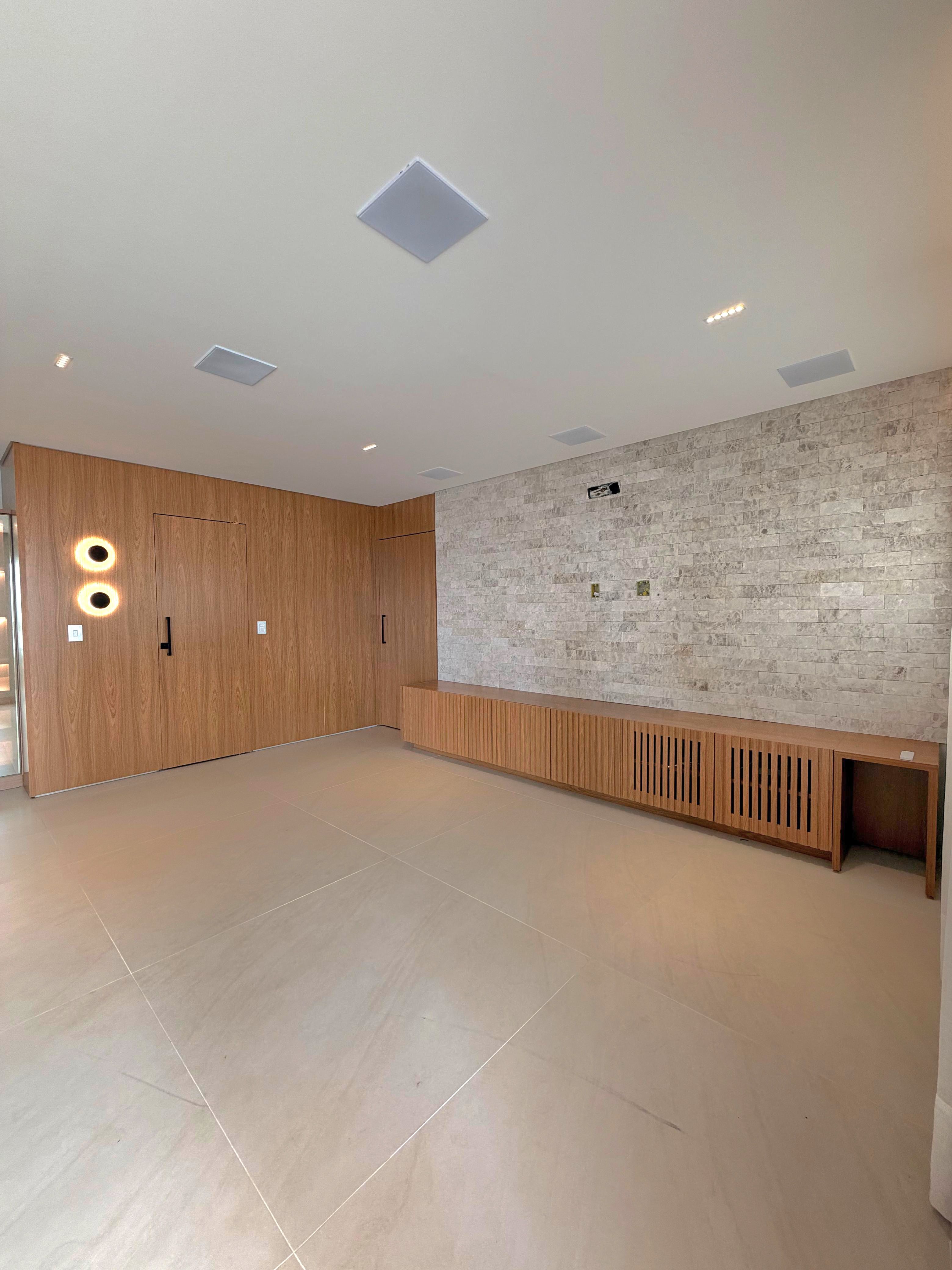 Cozinha com coifa Franke de ilha oster inox touch control 90cm, 2 pontos de ar condicionado na sala, projeto luminotécnico e sistema de som com 7 caixas de som Loud Áudio, embutidas no teto da sala de TV e na área do churrasco.