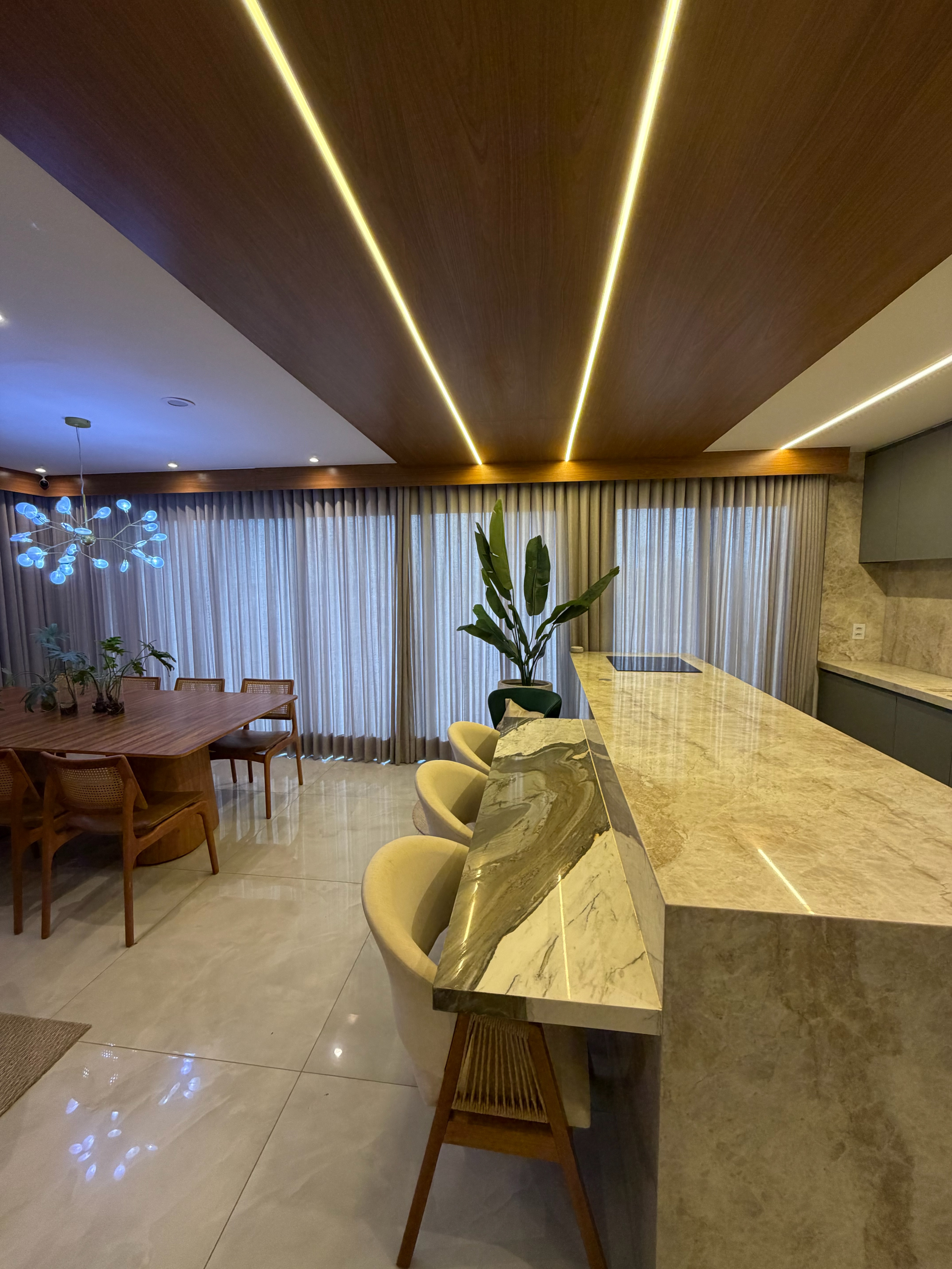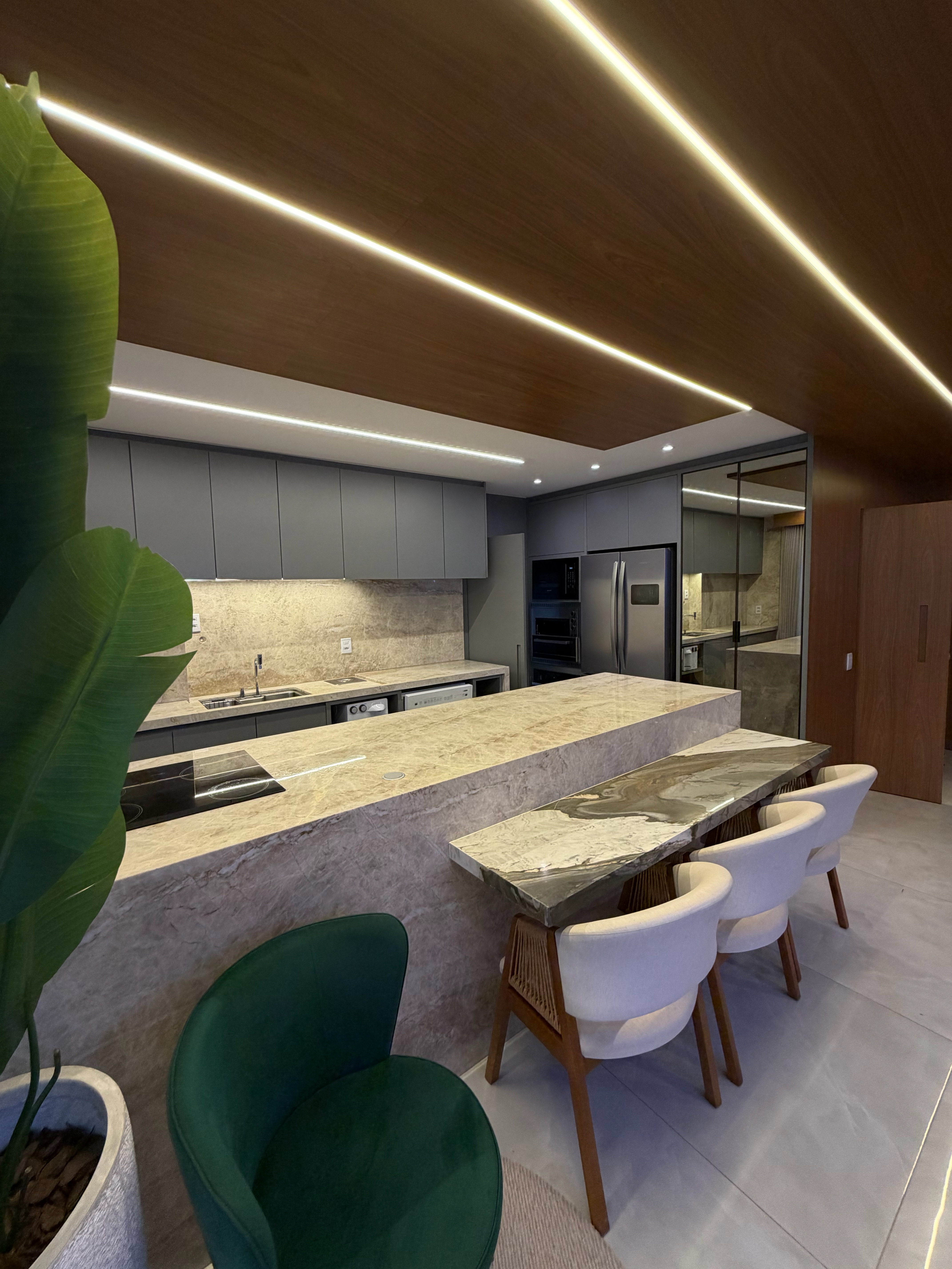 • Cozinha com ilha em mármore Taj Mahal, cristaleira iluminada em LED e eletrodomésticos modernos