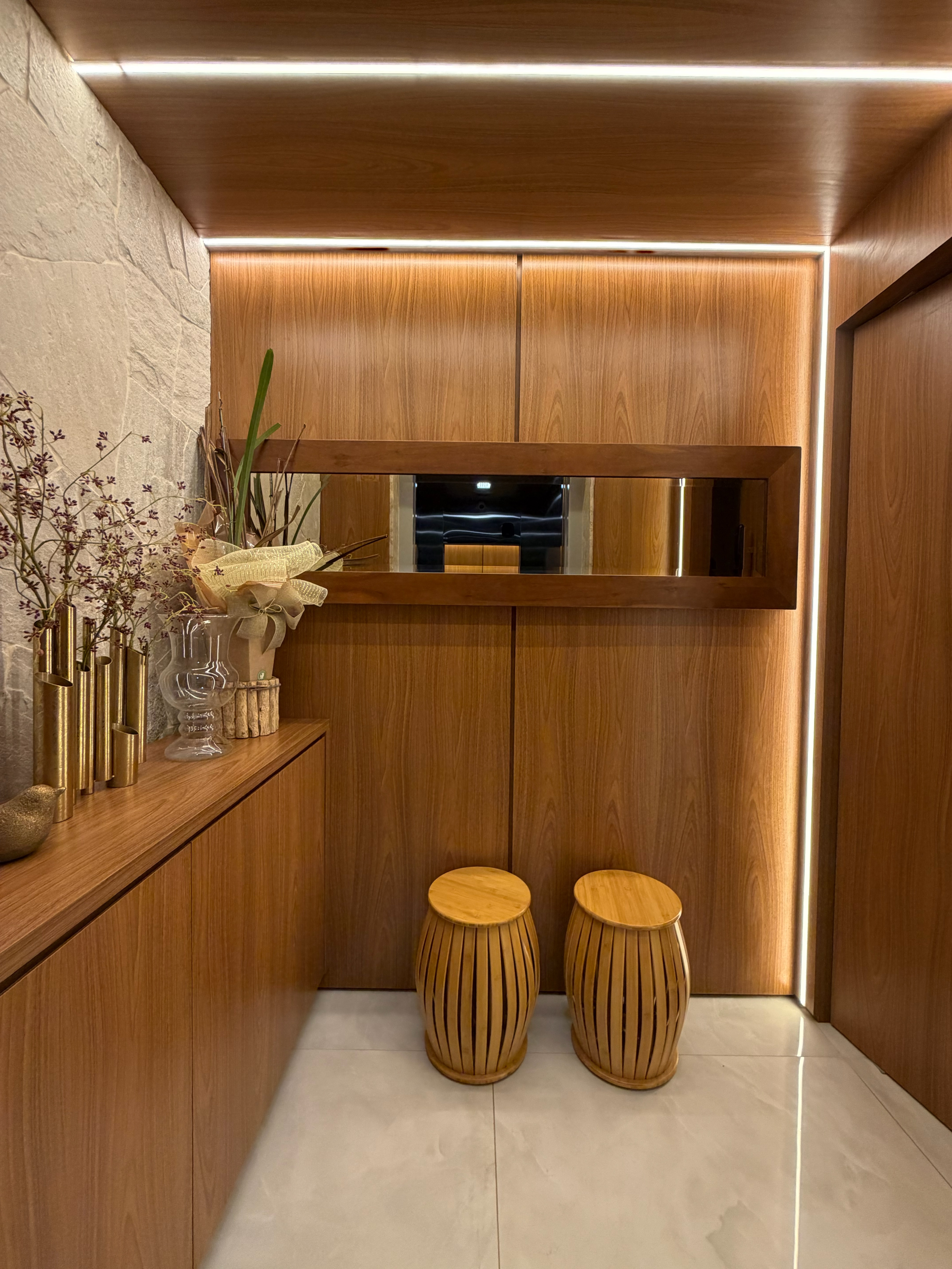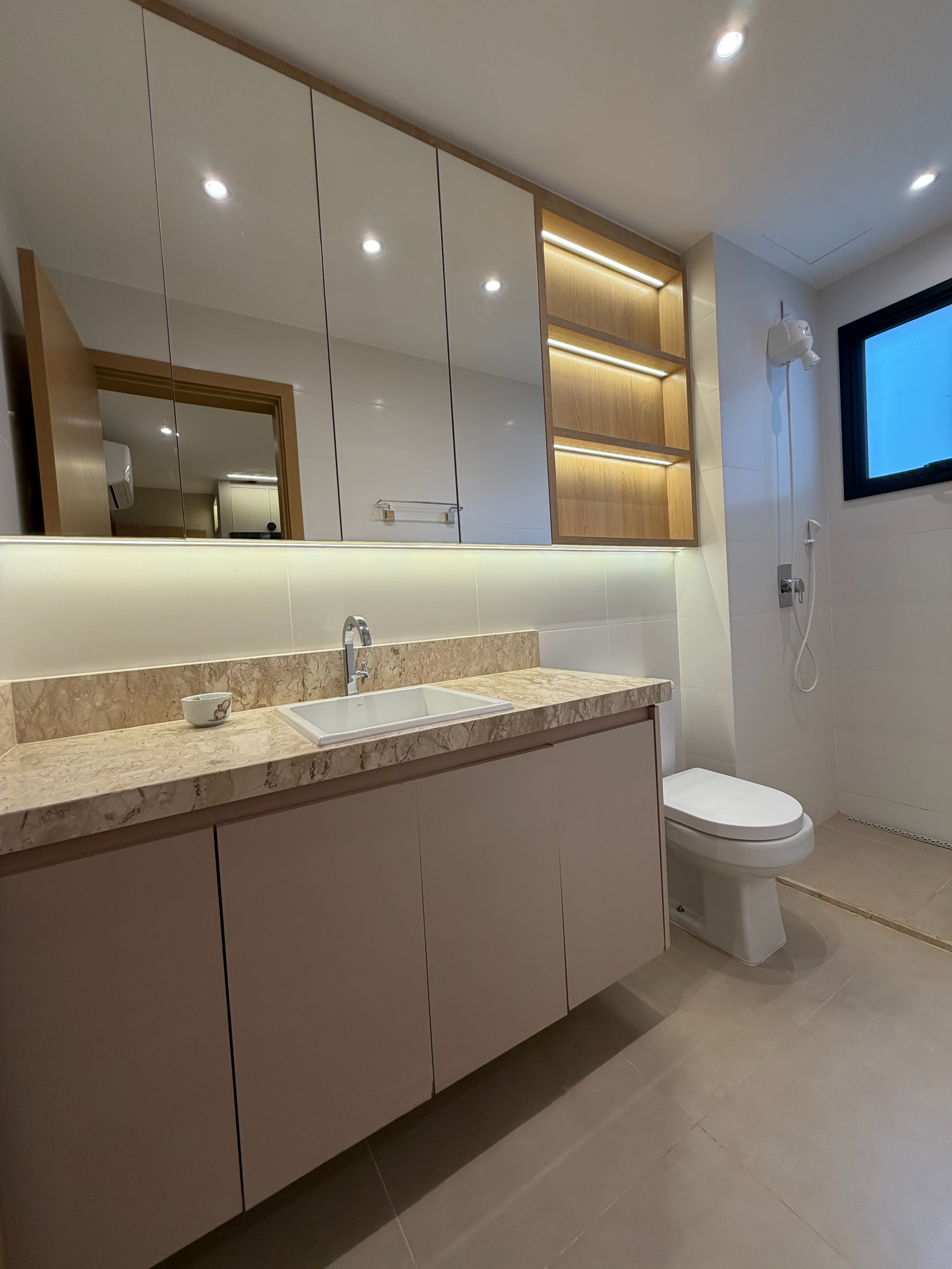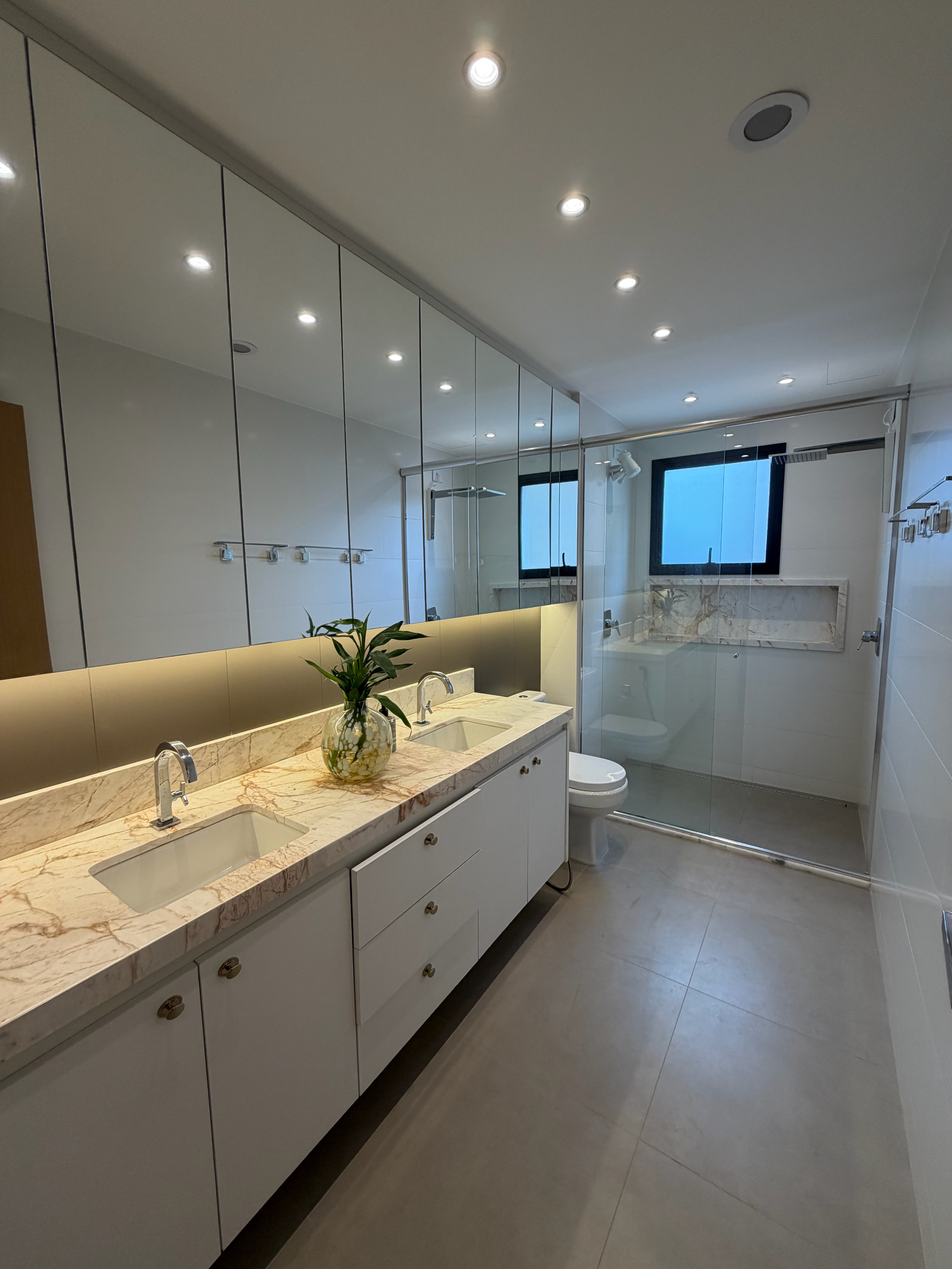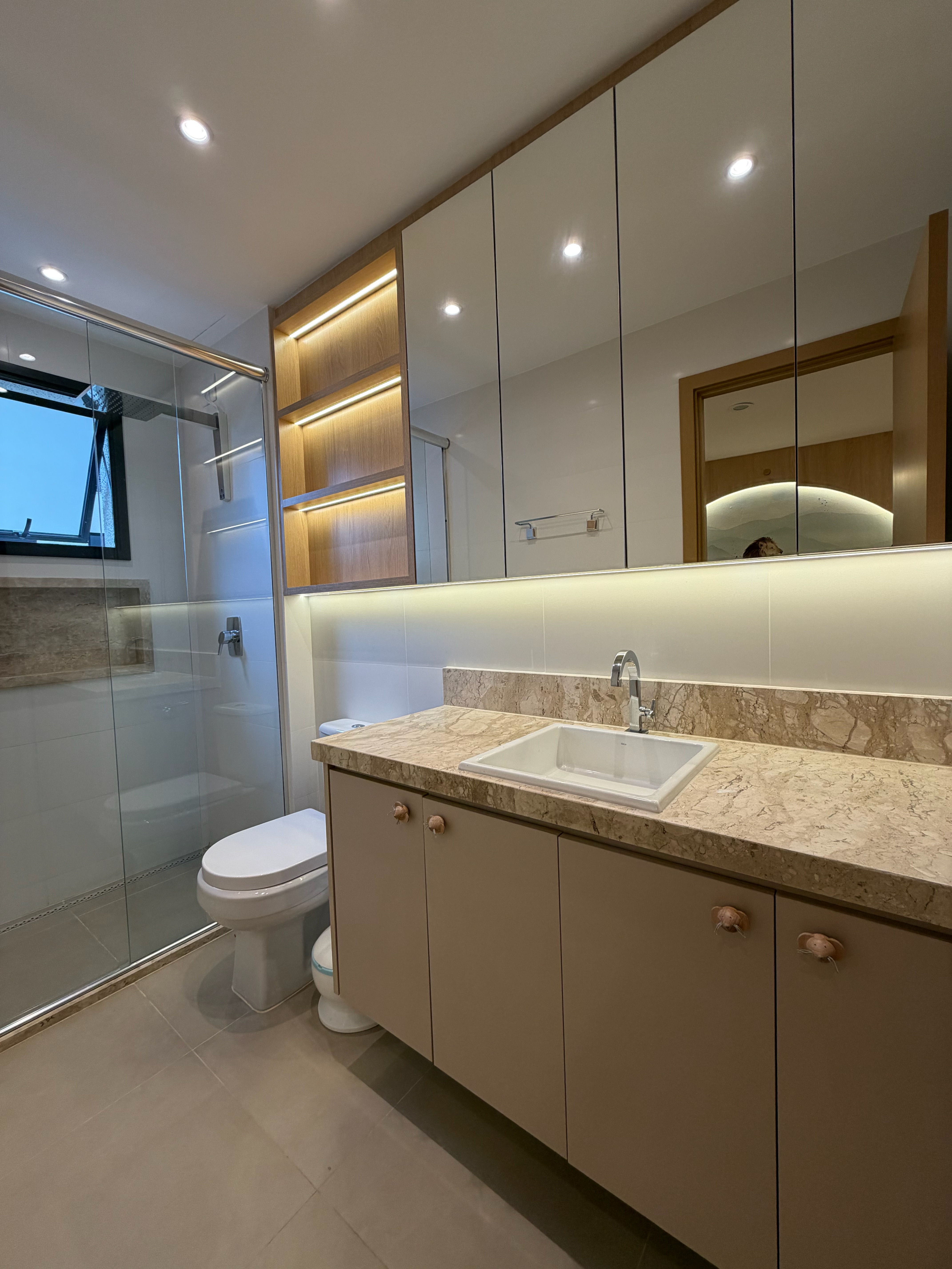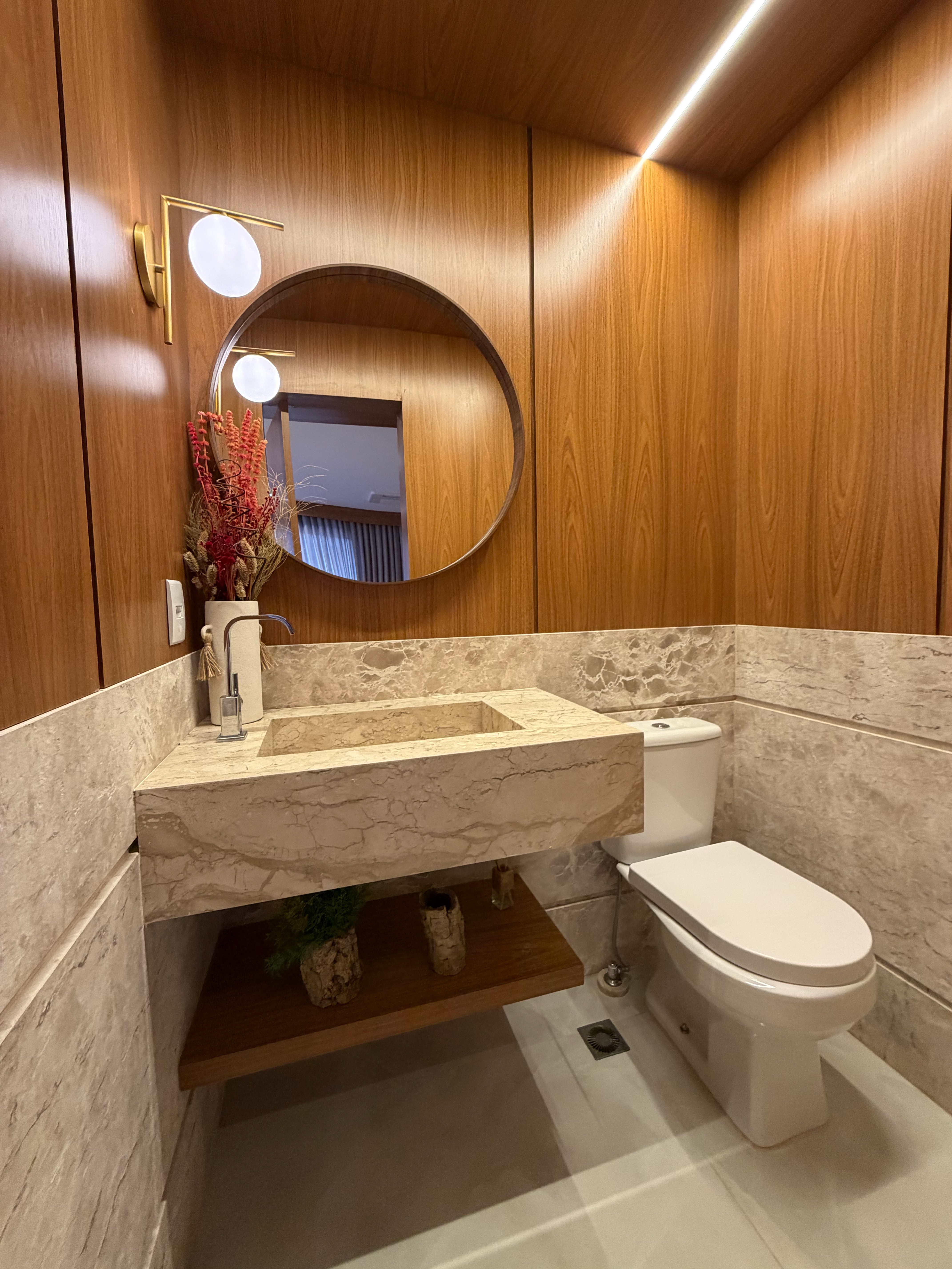 • Lavabo com acabamento em pedra e marcenaria sob medida