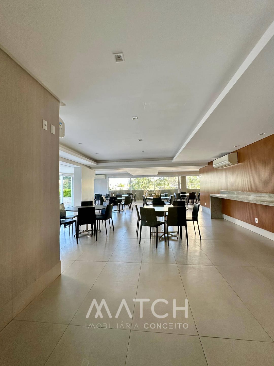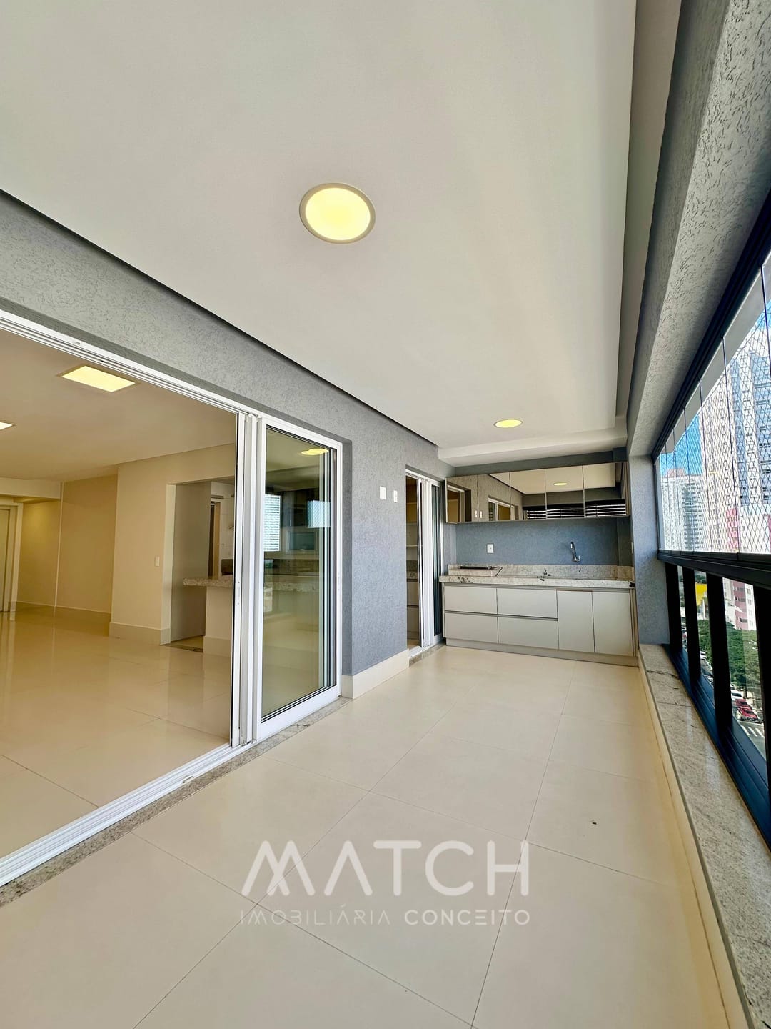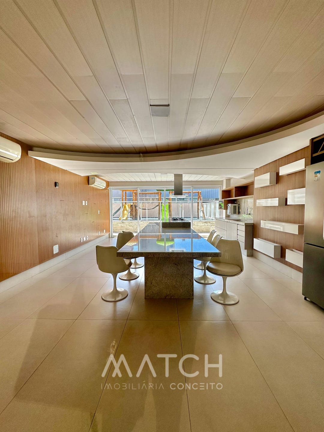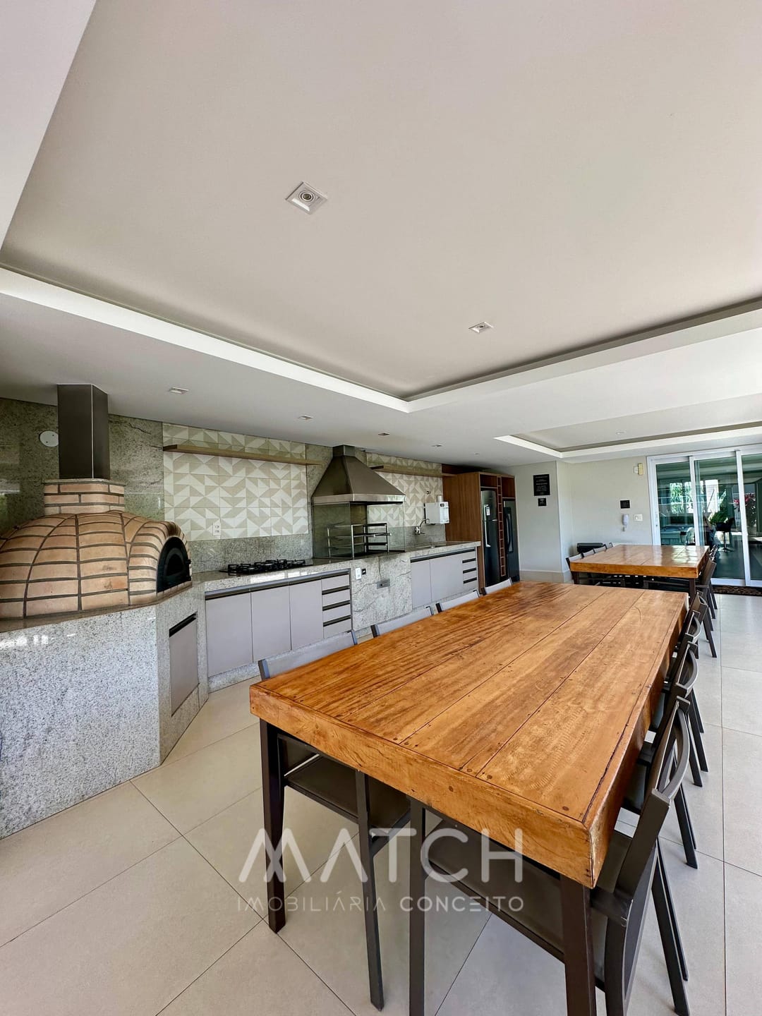Varanda ampla com churrasqueira ecológica.
