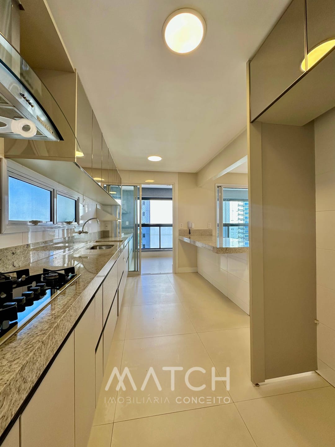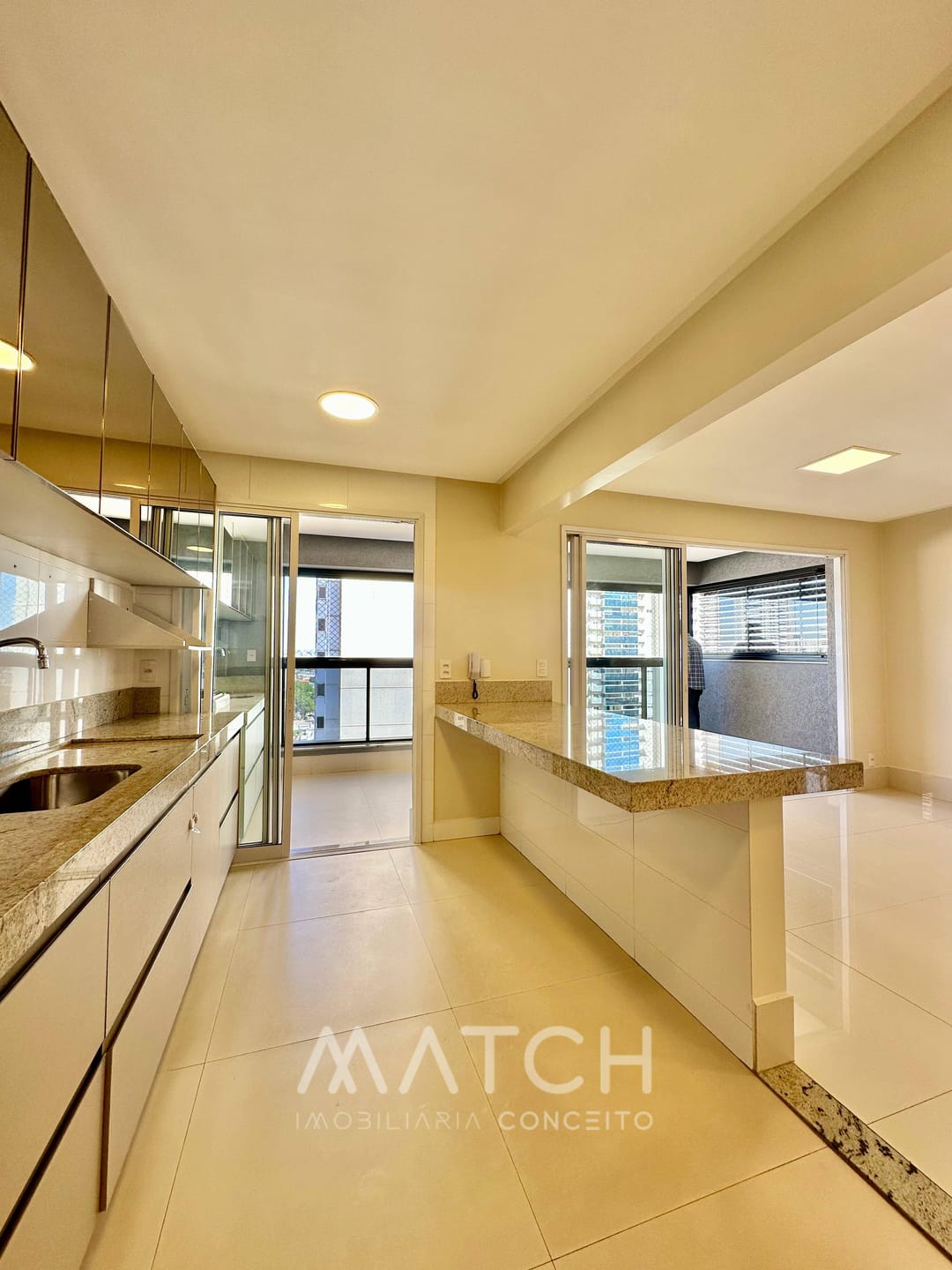Cozinha estilo americana completa em armários.