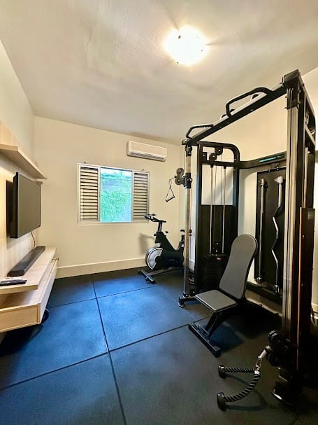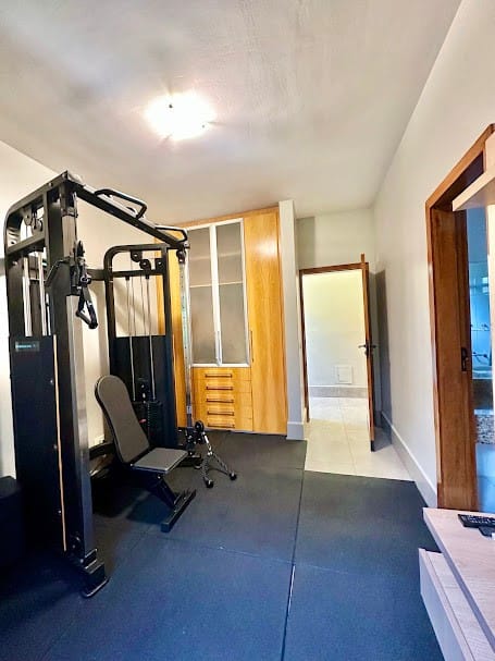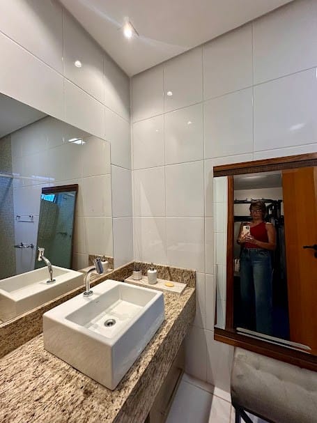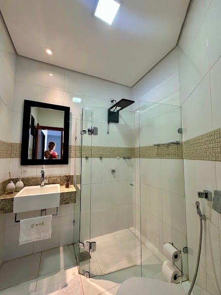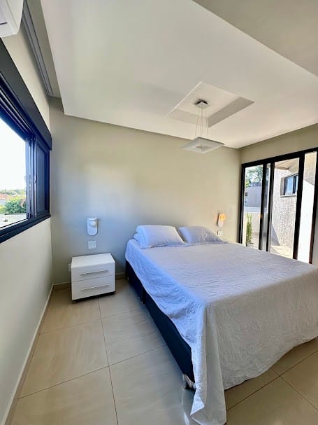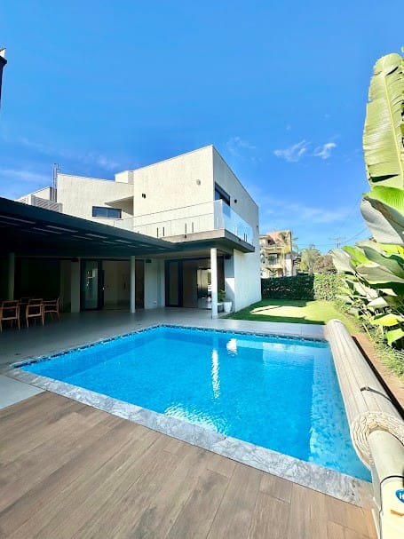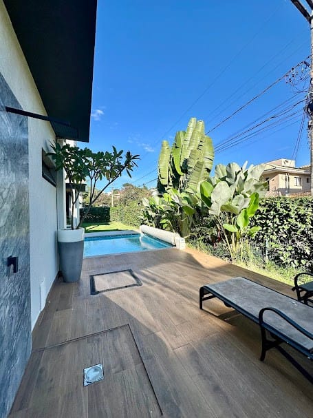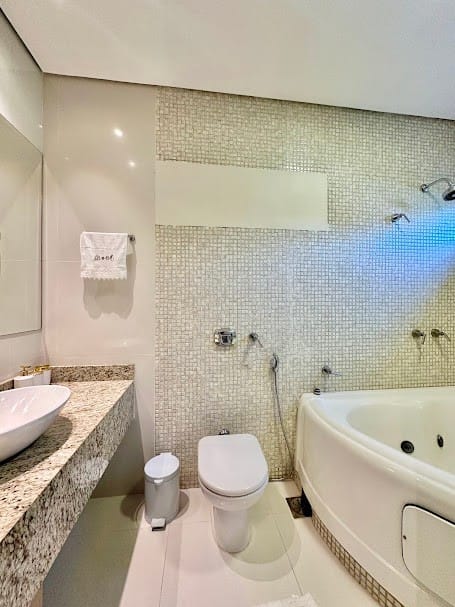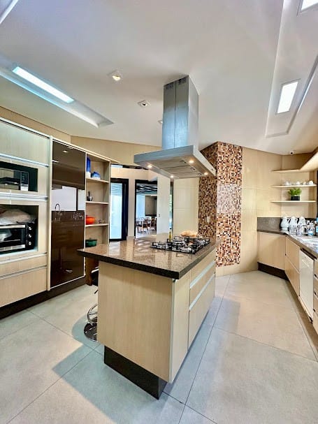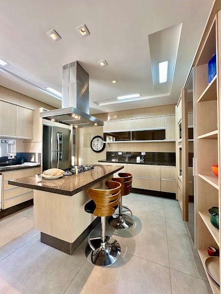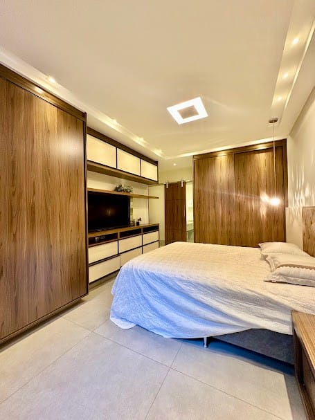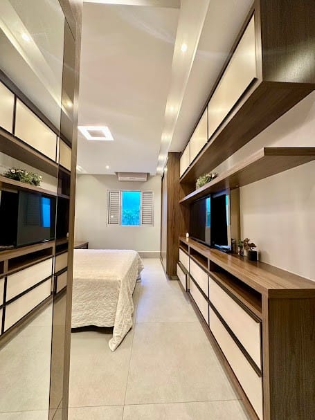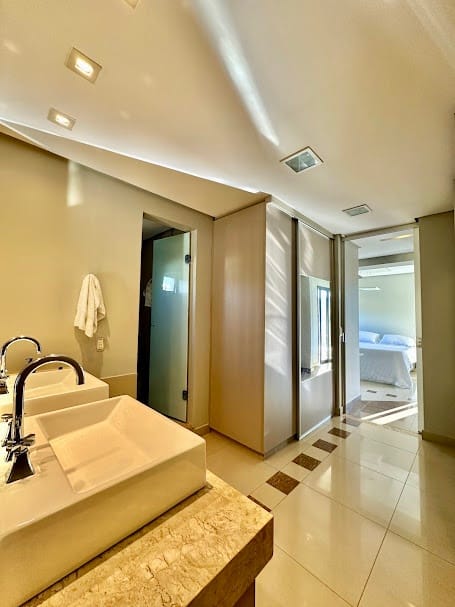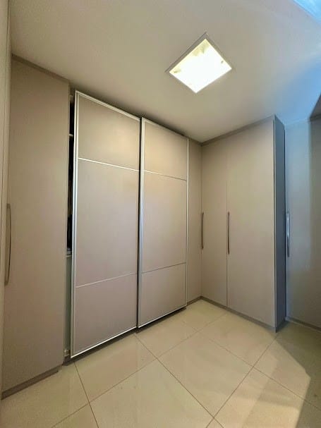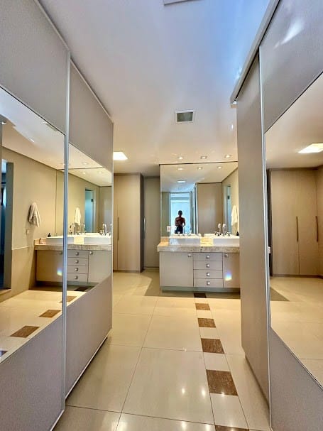 4 suítes completas em armários, sendo uma delas no mezanino, com closet e banheiro senhor/senhora.