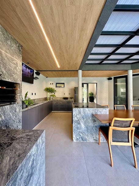 Varanda gourmet com churrasqueira a carvão.