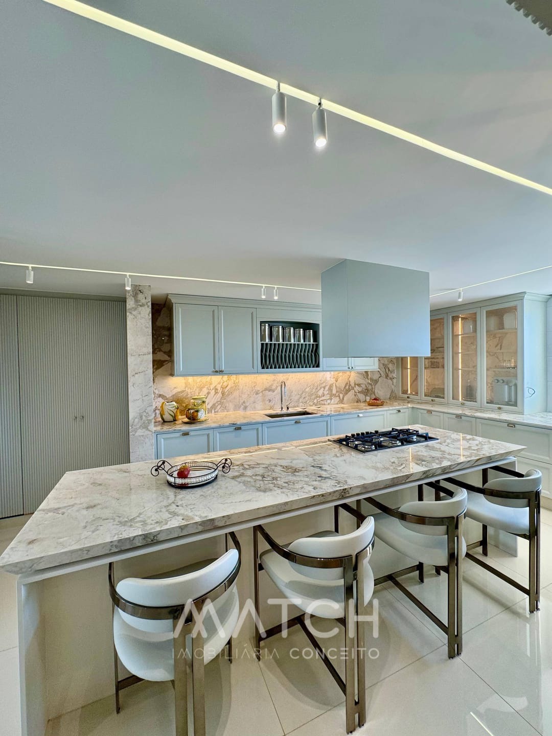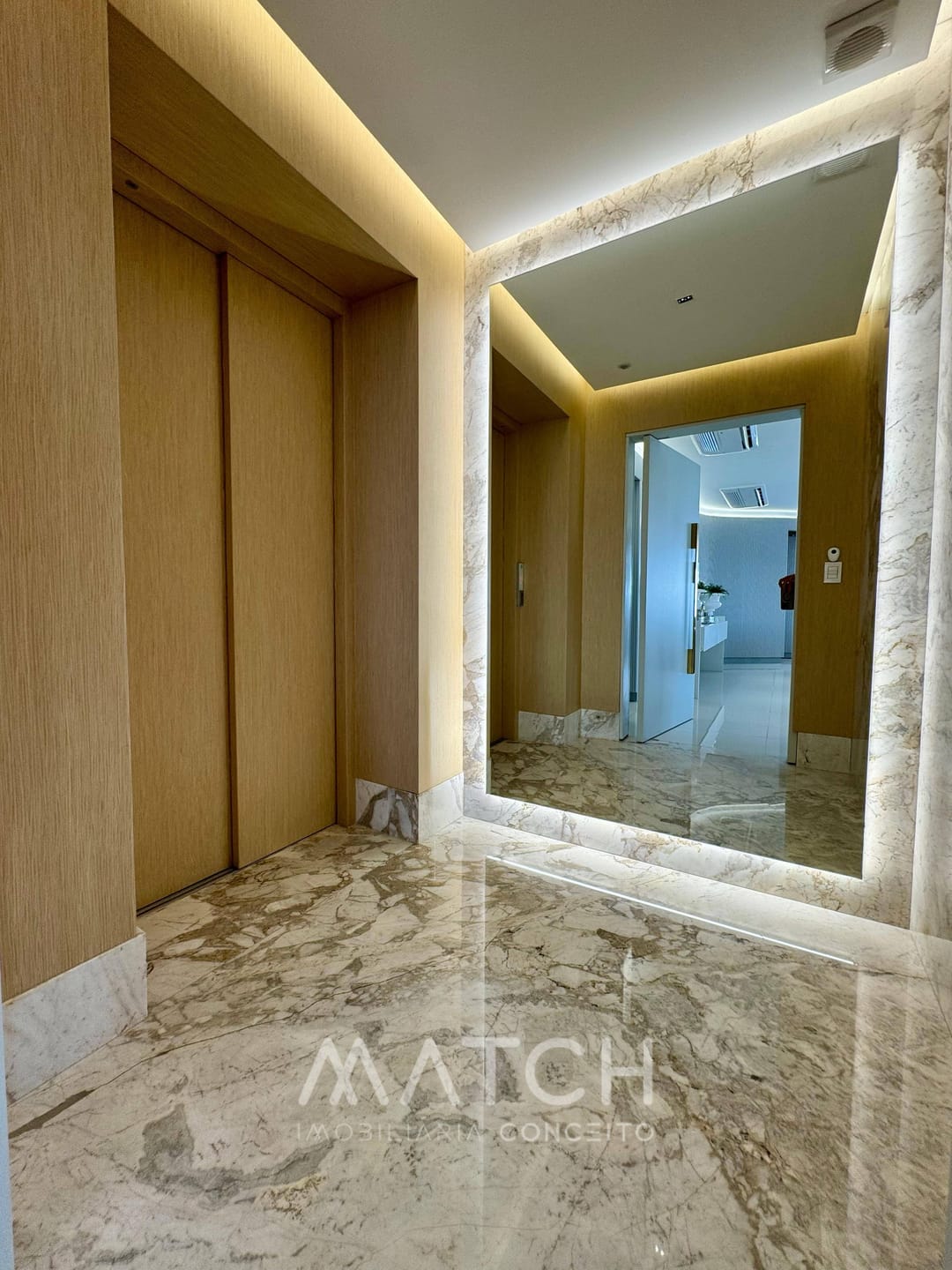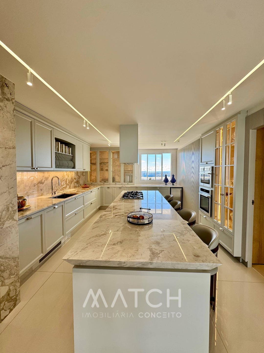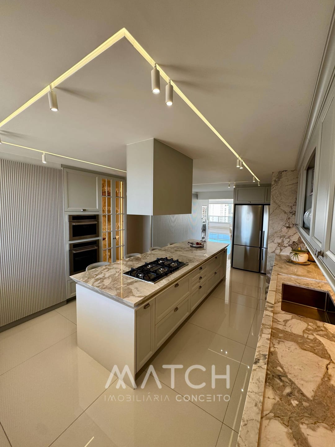 Todo apartamento revestido no mármore Calacata Michelângelo.