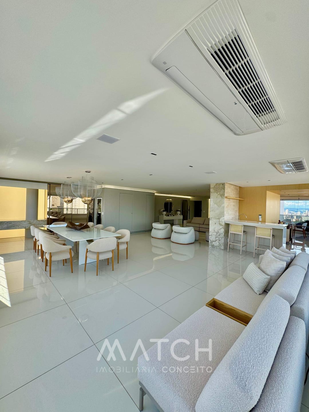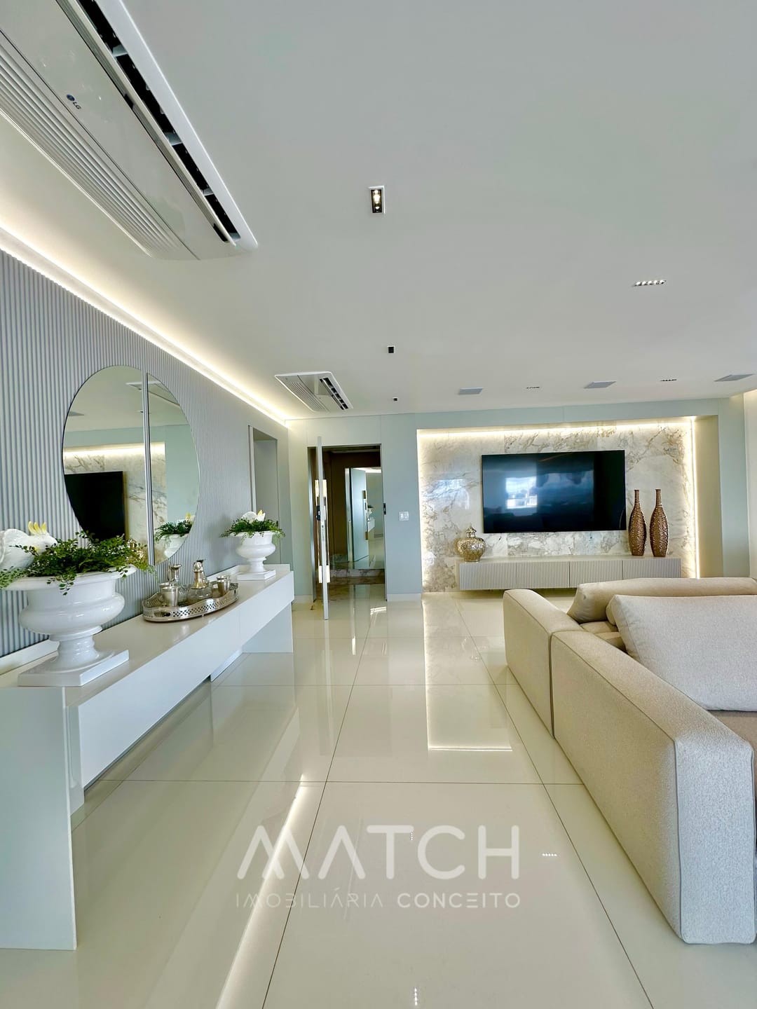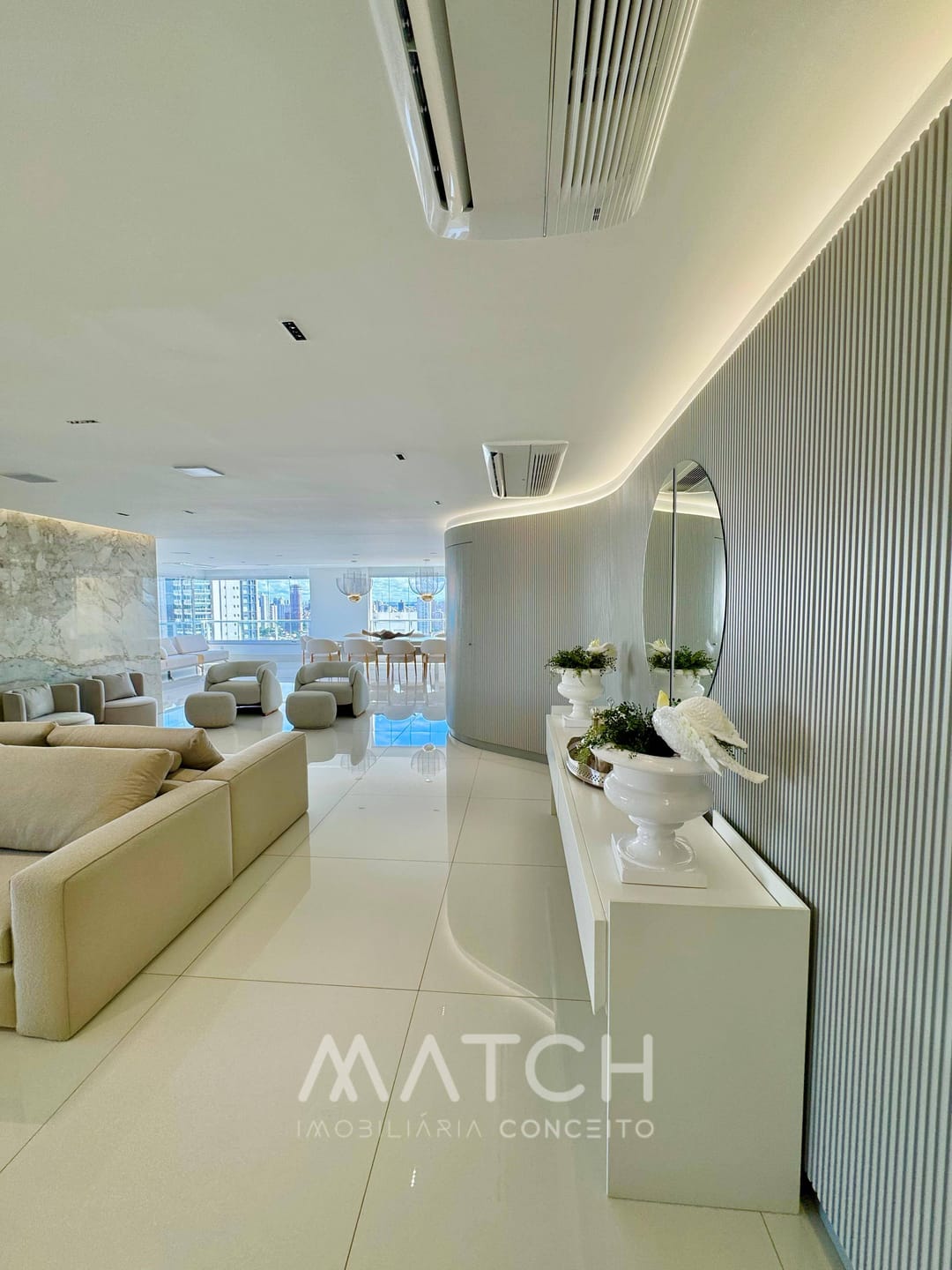 Todo apartamento revestido no mármore Calacata Michelângelo.