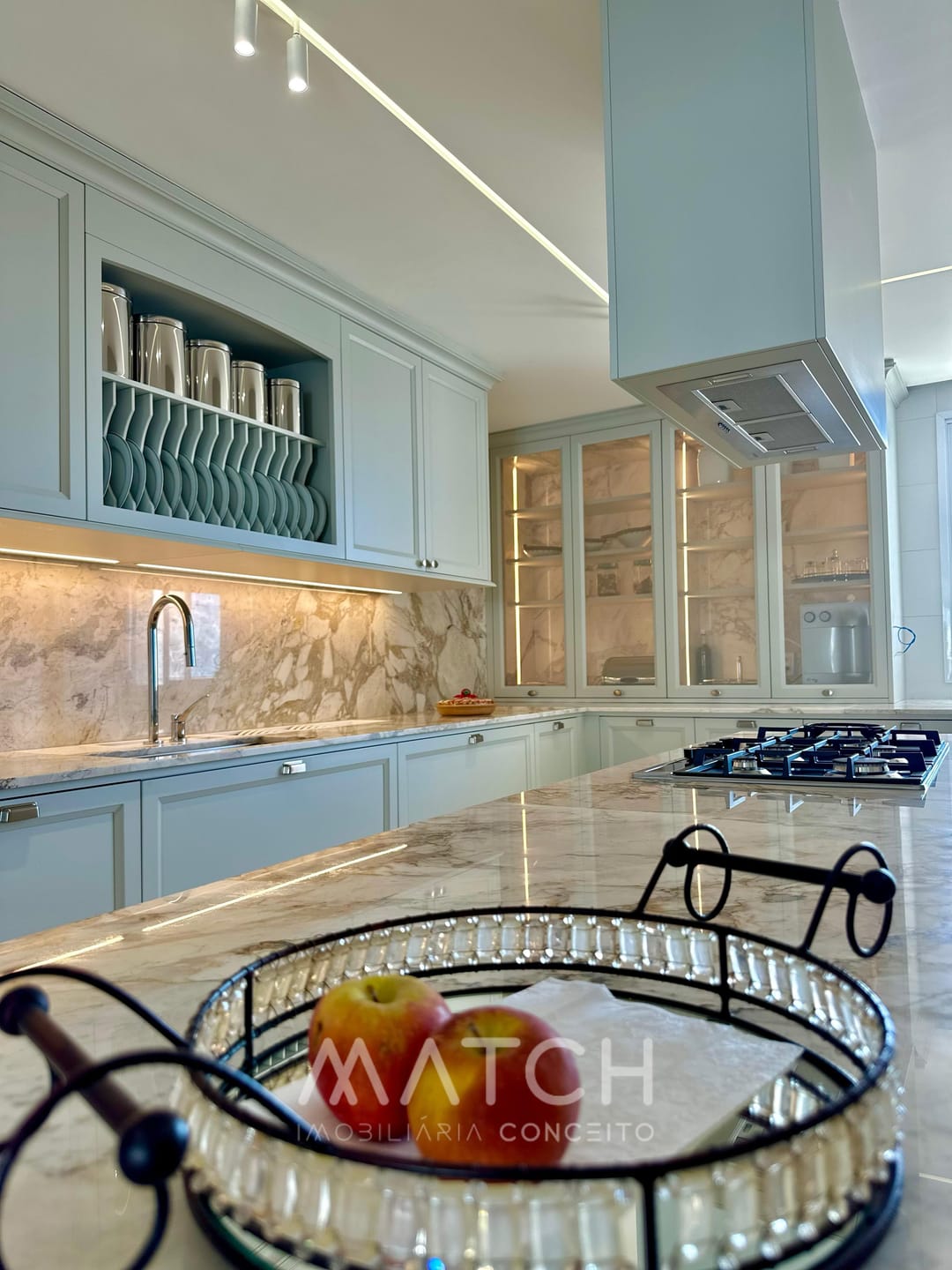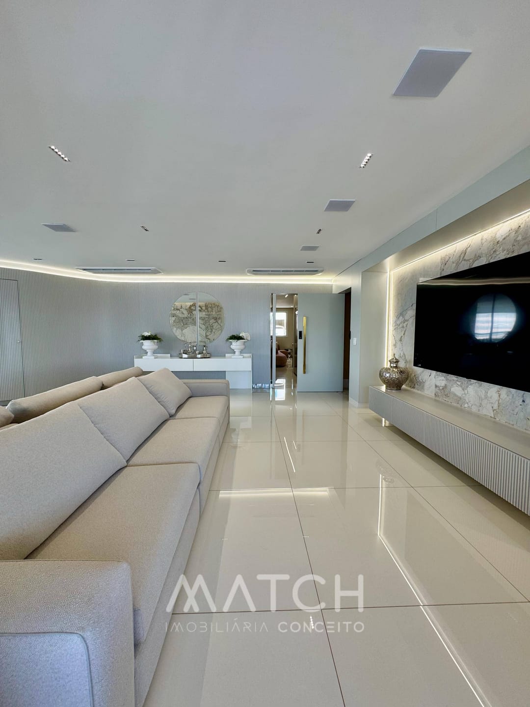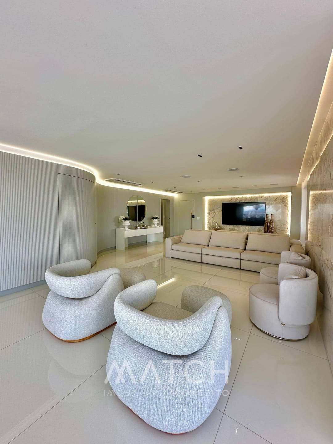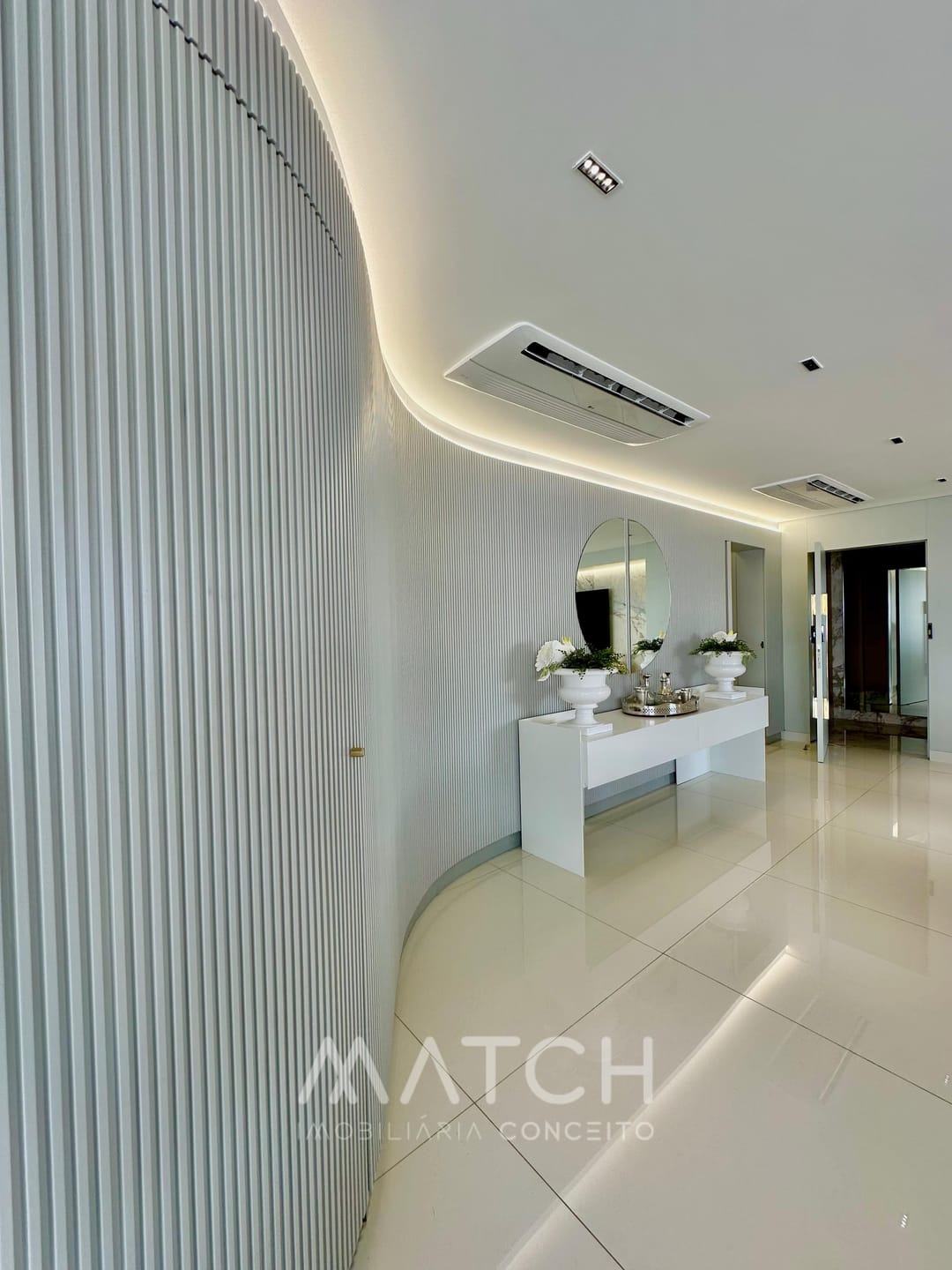 Todo apartamento revestido no mármore Calacata Michelângelo.