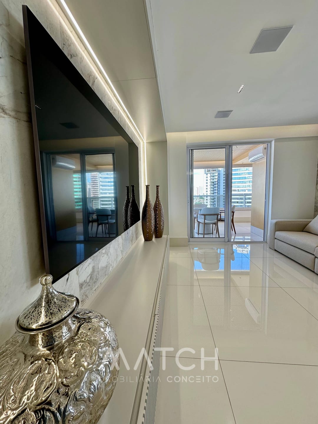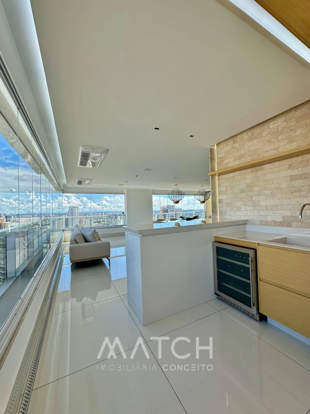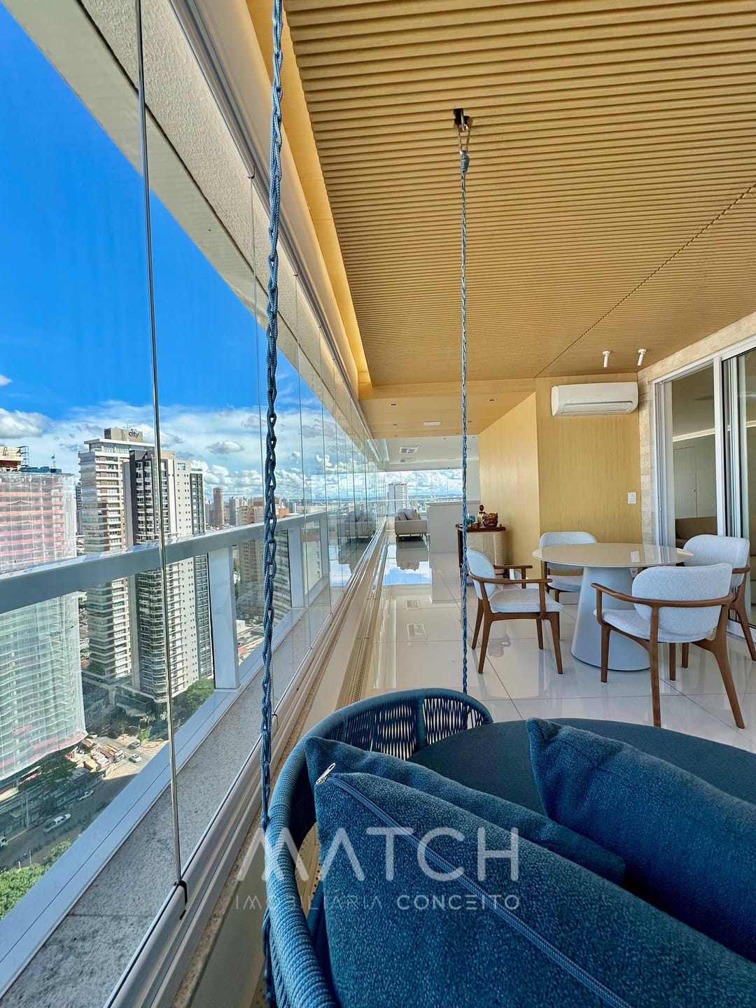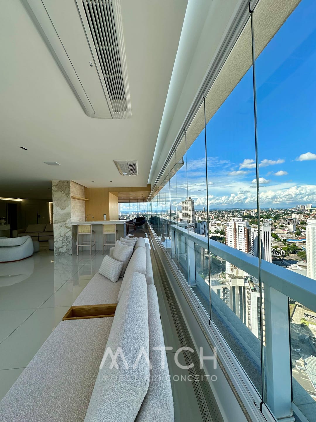 A varanda abraça todo apartamento.
